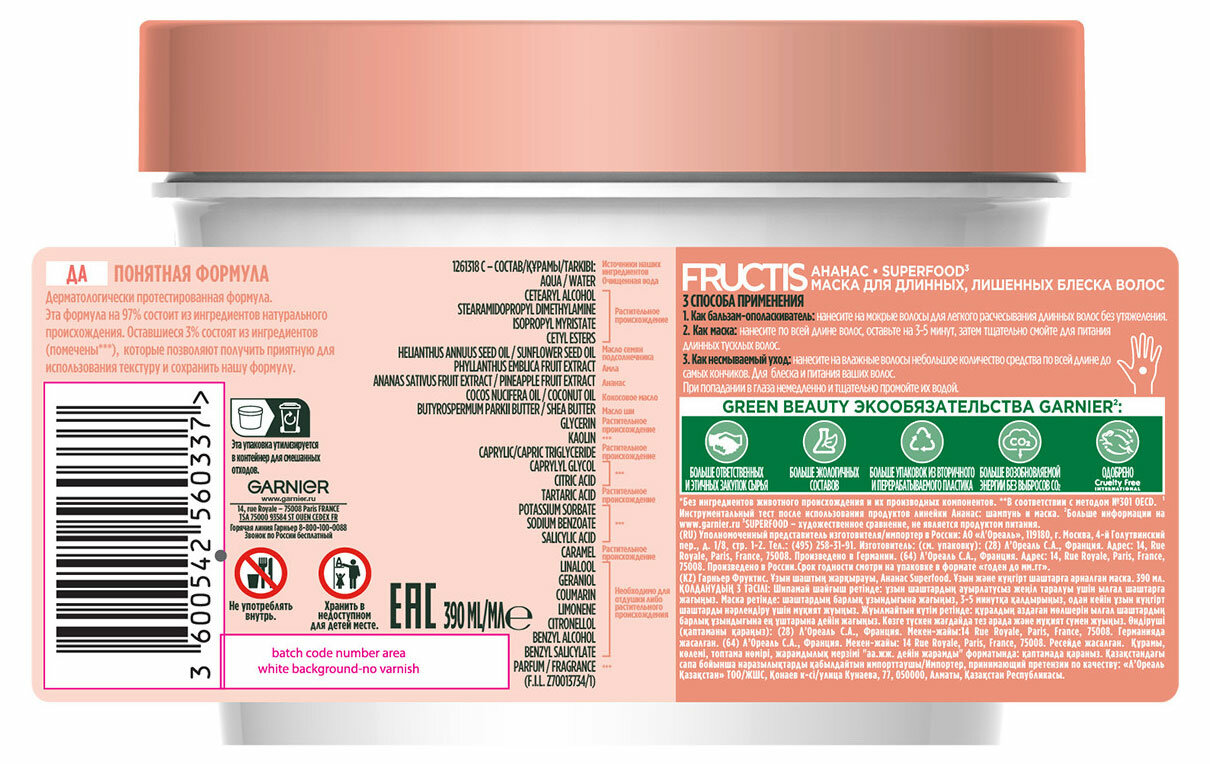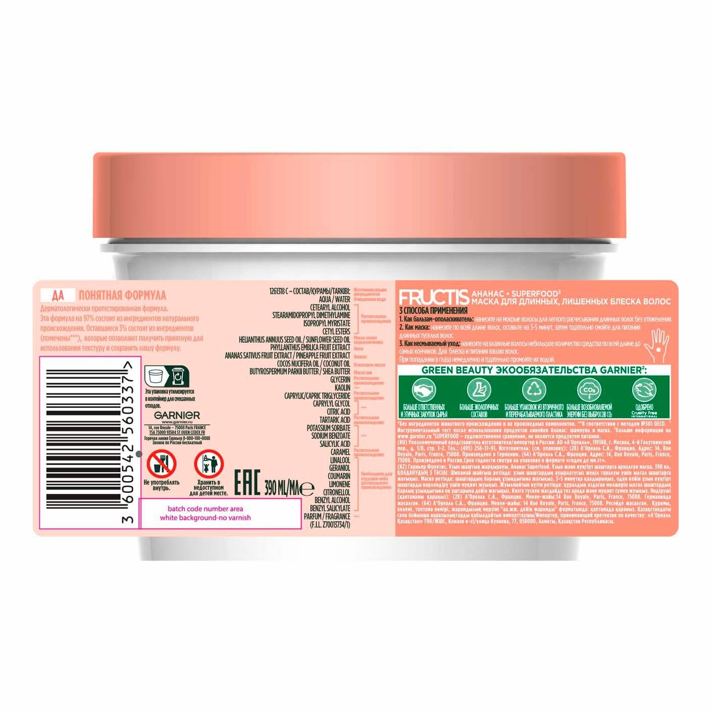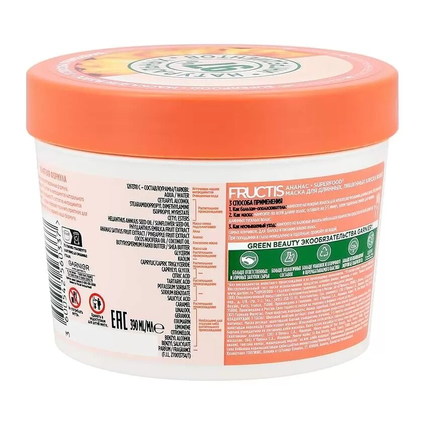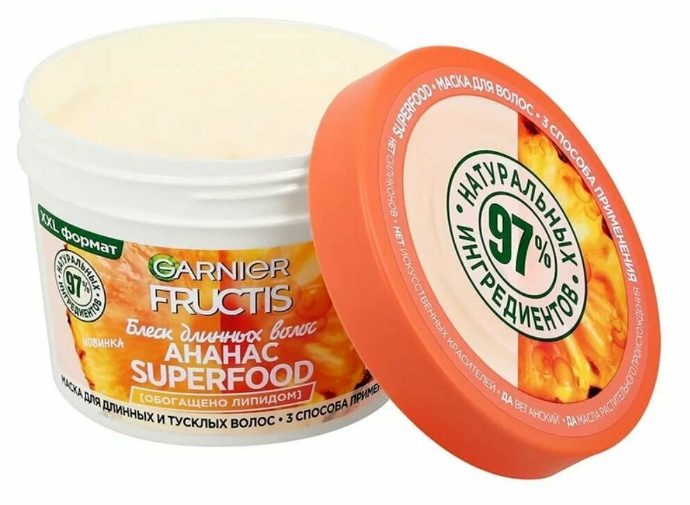 Маска для длинных и тусклых волос волос Garnier Fructis Superfood с ананасом. В 2 раза меньше секущихся кончиков'! Имеет 3 способа применения: как бальзам-ополаскиватель, как маска и как несмываемый уход. Формула на 97% состоит из натуральных ингредиентов! Текстура с питательными липидами мгновенно впитывается в волосы, усиливая блеск ваших волос по всей длине до самых кончиков. Веганская* и на 99% биоразлагаемая формула** не содержит парабенов, силиконов и искусственных красителей. 'Инструментальный тест после использования продуктов линейки Ананас: шампунь и маска. *Без ингредиентов животного происхождения и их производных компонентов. **В соответствии с методом 301 OECD.