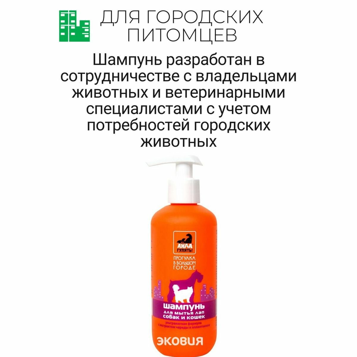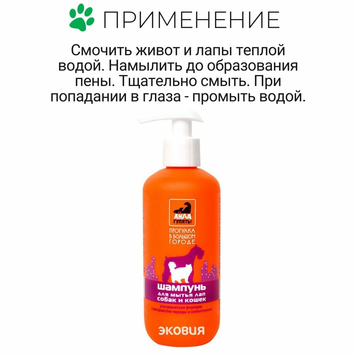 Шампунь для мытья лап собак и кошек, айда гулять, 300 млШампунь для мытья лап собак и кошек.Для бережного очищения лап и живота после прогулки при небольших загрязнениях (от пыли, грязи) и при бытовых загрязнениях.Для мытья лап животных с чувствительной кожей. Шампунь подходит для интимной гигиены. Мягкая моющая основа деликатно очищает шерсть и кожу лап и живота Экстракт череды снимает зуд, раздражение и шелушение кожи Аллантоин смягчает и успокаивает чувствительную кожу. Способ применения: смочить живот и лапы теплой водой. Намылить до образования пены. Тщательно смыть. При попадании в глаза - промыть водой.