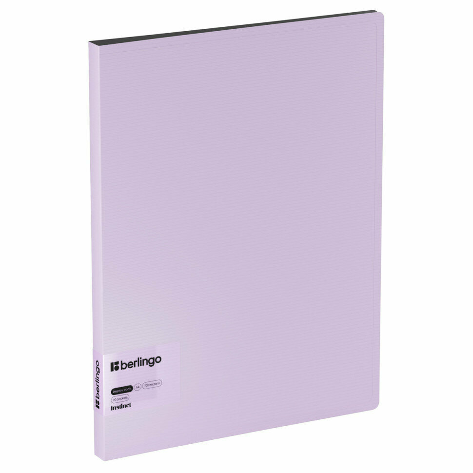 Папка Berlingo Instinct формата А4 содержит 20 вкладышей, которые надёжно защищают листы от повреждений. Листы-карманы увеличенной толщины 30мкм надежно скреплены сваркой. Размер изделия: 310*235*17 мм, ширина корешка: 17 мм, толщина материала: 700 мкм. Лавандовый цвет внешней стороны в сочетании с фактурой "горизонтальные линии", черный цвет внутренней поверхности. На внутренней стороне обложки оснащена плотным прозрачным карманом для удобного хранения мелочей: ручки, заметок, визиток, дисков, флешек и др. Папка вмещает до 100 бумажных листов. Упакована в индивидуальный прозрачный пакет