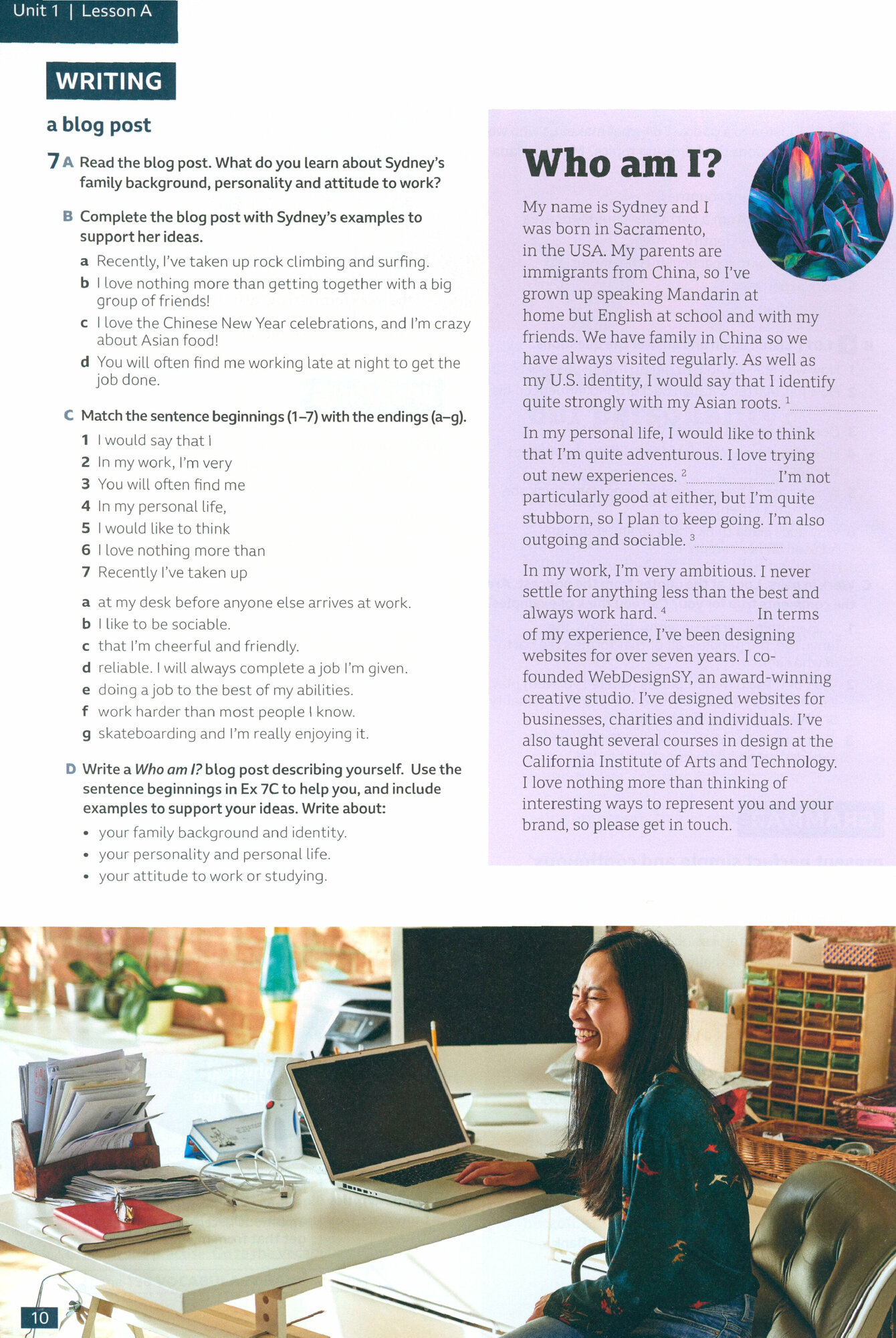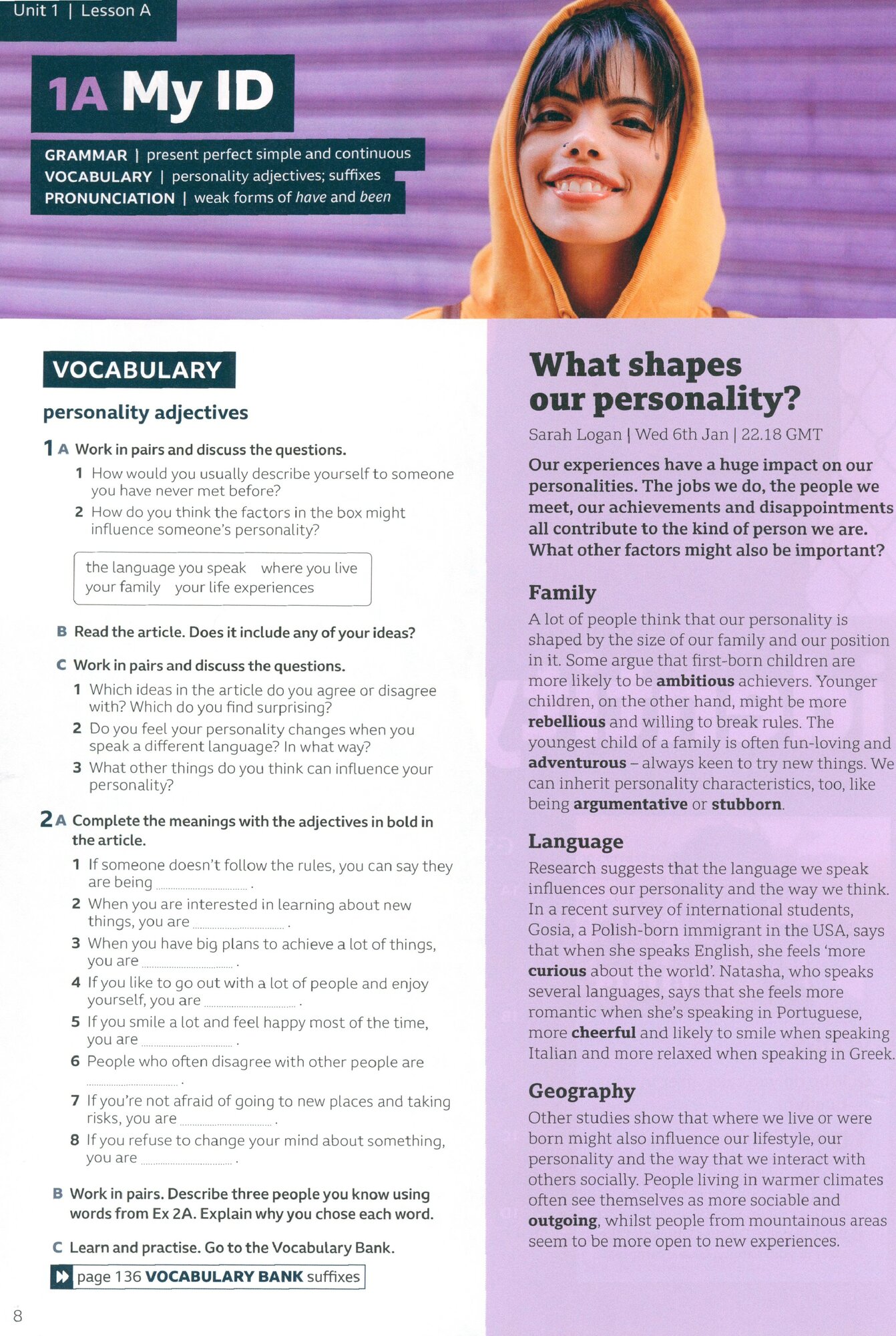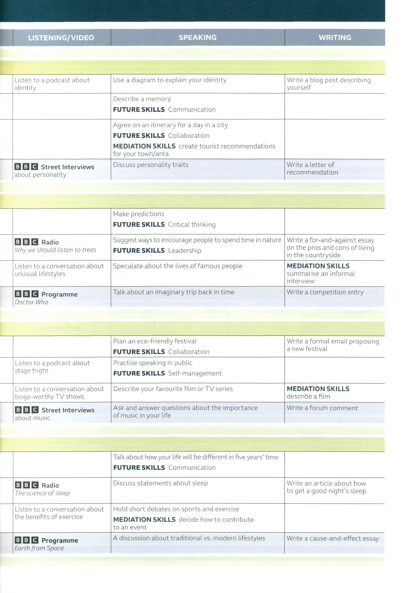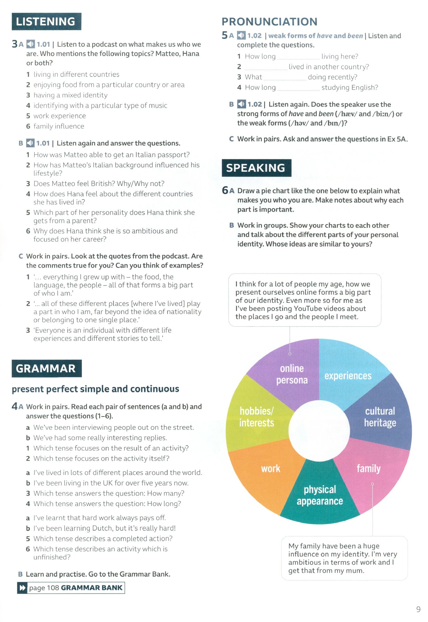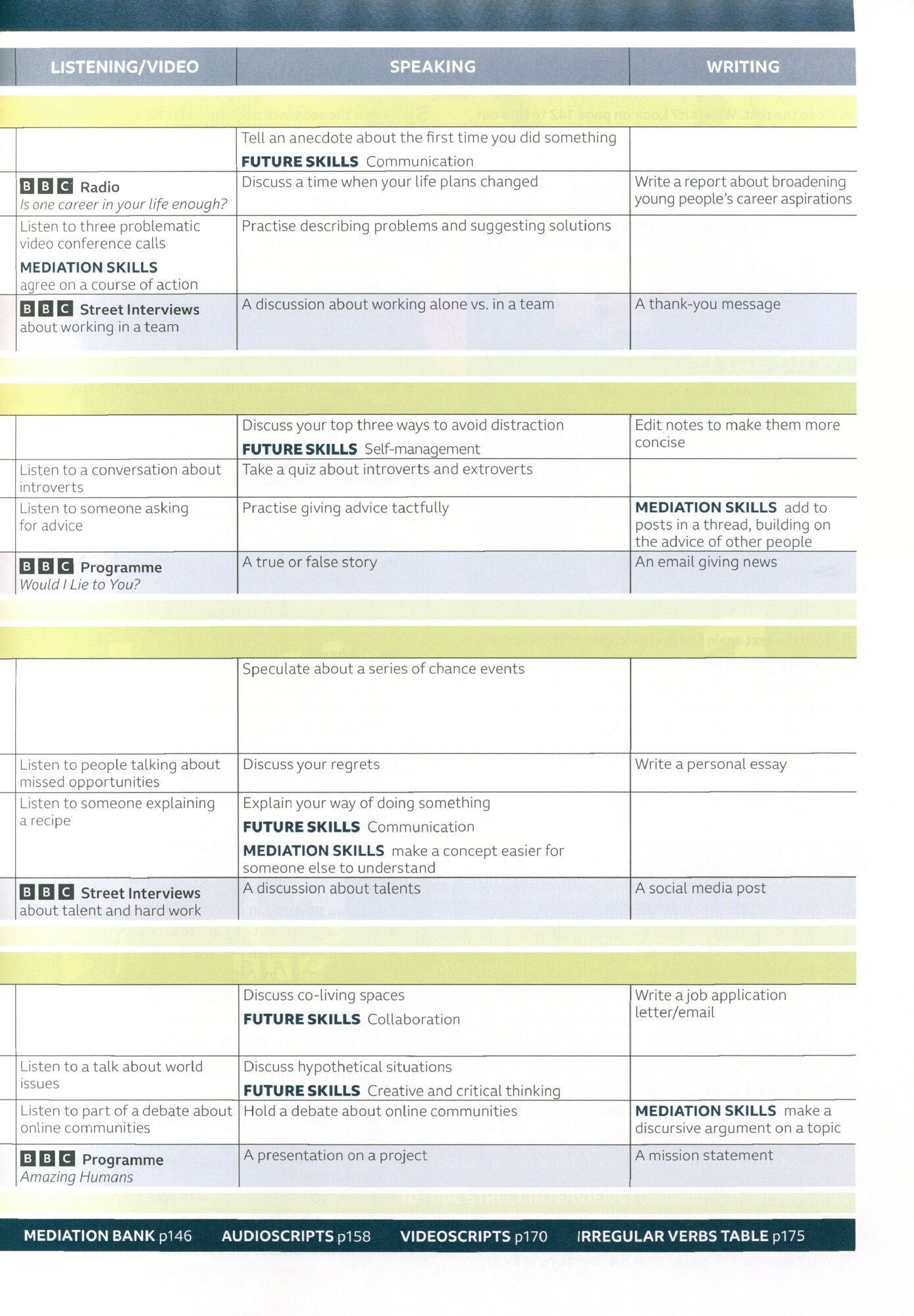 Учебник состоит из восьми разделов, каждый из которых содержит по четыре урока, а также ознакомительный раздел. Каждый раздел содержит видеоблоги, снятые реальными людьми; уроки, охватывающие четыре навыка, грамматику, задания на улучшение словарного запаса и произношения; уроки функционального языка для применения на практике языка реального мира; видеоуроки BBC с заданиями по устной и письменной речи; упражнения на аудирование и разговорную речь в паре; грамматический и словарный банки.