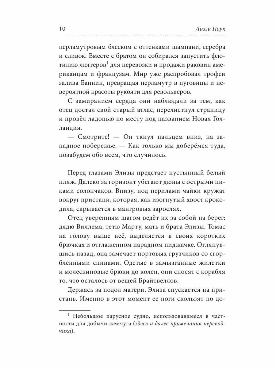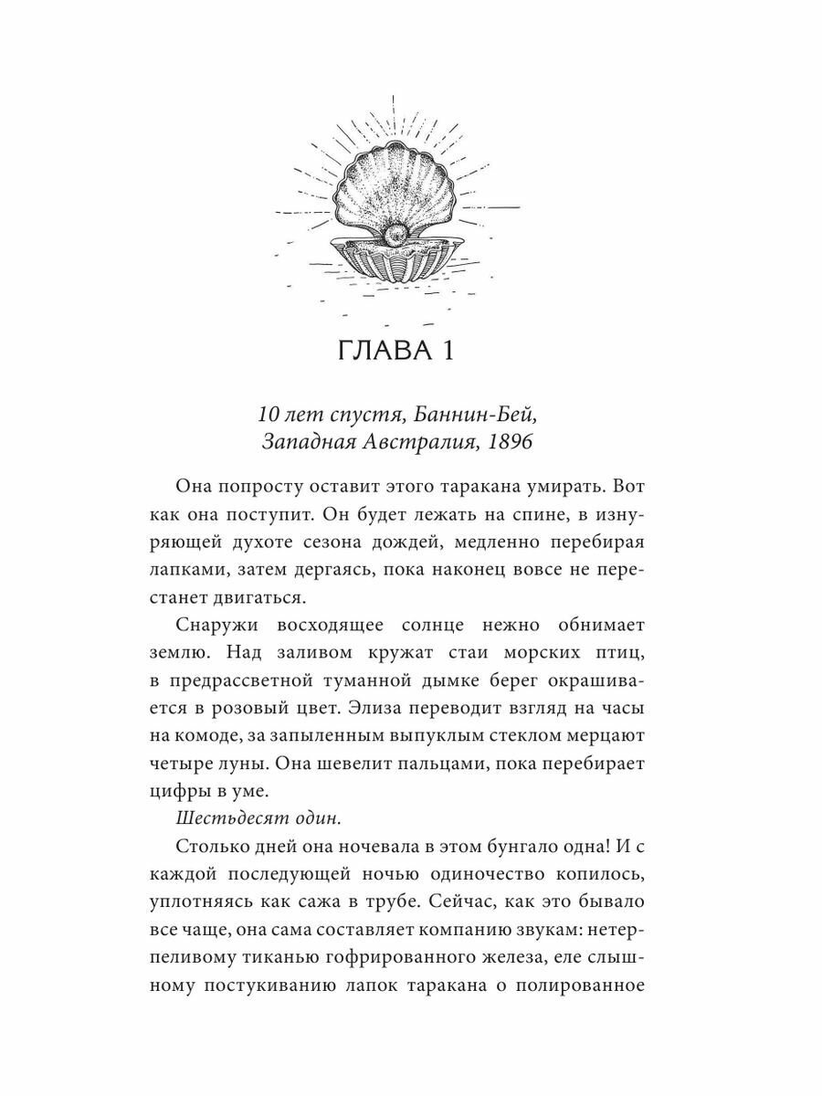 Семейство Брайтвелл, приплыв из Англии, обосновывается в новом доме в Австралии. Десятилетняя Элиза мало что знает о том, что ждет их на этих берегах, где жемчужные раковины порой достигают размеров суповых тарелок и где за экзотической красотой повсюду скрывается опасность. Отец обещал, что именно жемчуг обеспечит им состояние.