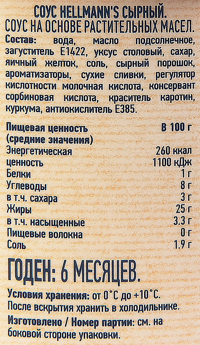 HELLMANN'S Соус Сырный обладает идеально сбалансированным нежным вкусом. Создан на основе настоящих яичных желтков с добавлением подсолнечного масла.