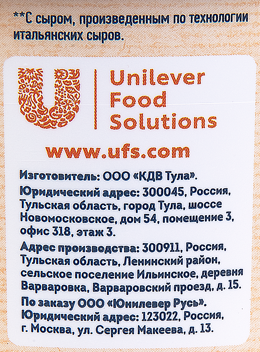 | Состав | Вода, масло подсолнечное, загуститель Е1422, уксус столовый, сахар, яичный желток, соль, сырный порошок, ароматизаторы, сухие сливки, регулятор кислотности молочная кислота, консервант сорбиновая кислота, краситель каротин, куркума, антиокислитель Е385. |