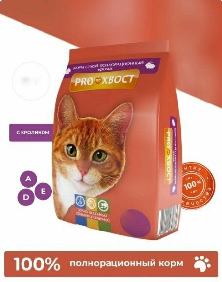 Полнорационный сбалансированный сухой корм для взрослых кошек всех пород с кроликом. Подходит для ежедневного кормления.Сухой корм PROХВОСТ для кошек имеет превосходный вкус, который достигается за счет высокого содержания белка животного происхождения.- Крокеты корма создают эффект механической чистки зубов и обеспечивают хорошую гигиену полости рта и зубов.