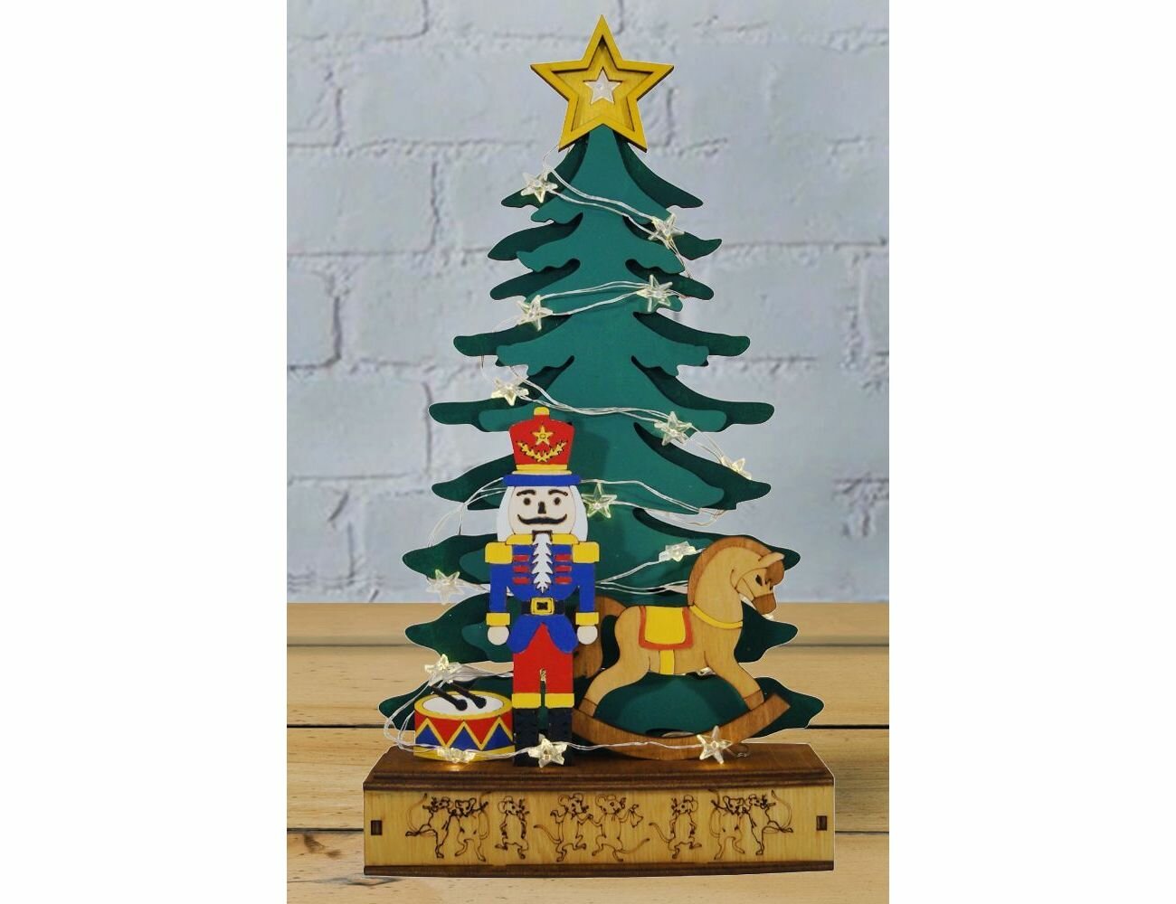 Внимание, внимание – праздник начинается, и он будет просто сказочным, ведь Щелкунчик уже на своём самом ответственном посту под ёлочкой, которую подсвечивают маленькие, но такие волшебные тёплые звёздочки, а значит будничные мысли не смогут проникнуть в ваше новогоднее настроение! Лошадка-качалка готова умчать вас в страну сказок и чудес, барабан только и ждёт момента, чтобы выбить приветственную дробь, а мышиной войско перевоспитано и не только не станет портить праздник, а вовсе наоборот – будет забавлять вас своими весёлыми танцами! Характеристики:Размер: 31*17 см.Материал: дерево.Подсветка: 20 теплых белых LED ламп.Работает от батареек: 2 шт, тип AA (в комплект не входят).Для использования в помещении. Производитель - STAR trading, Россия.Производство размещено в России.