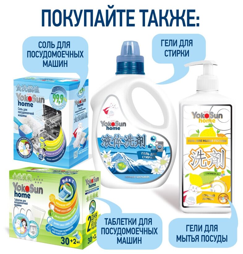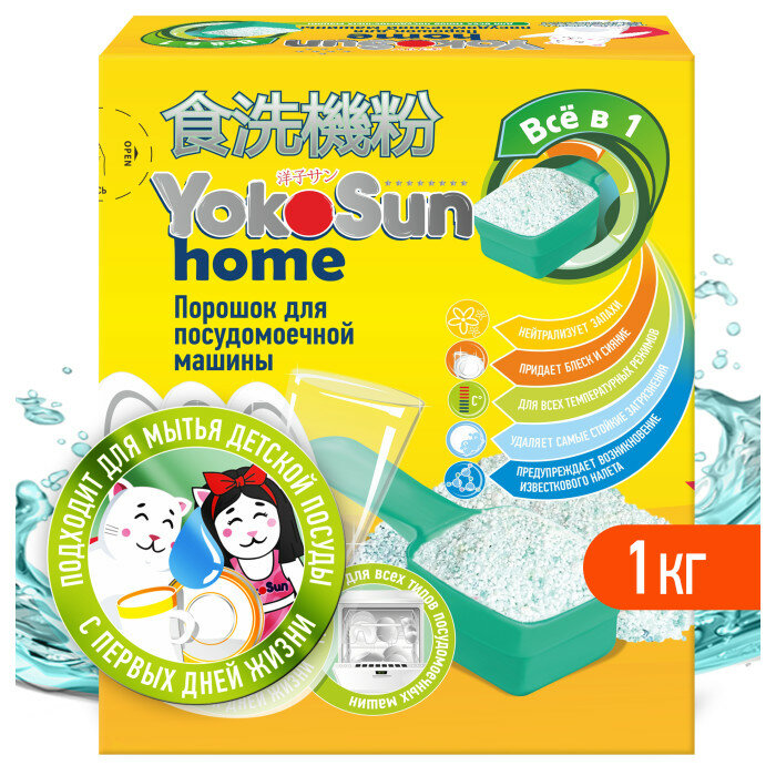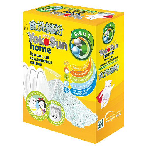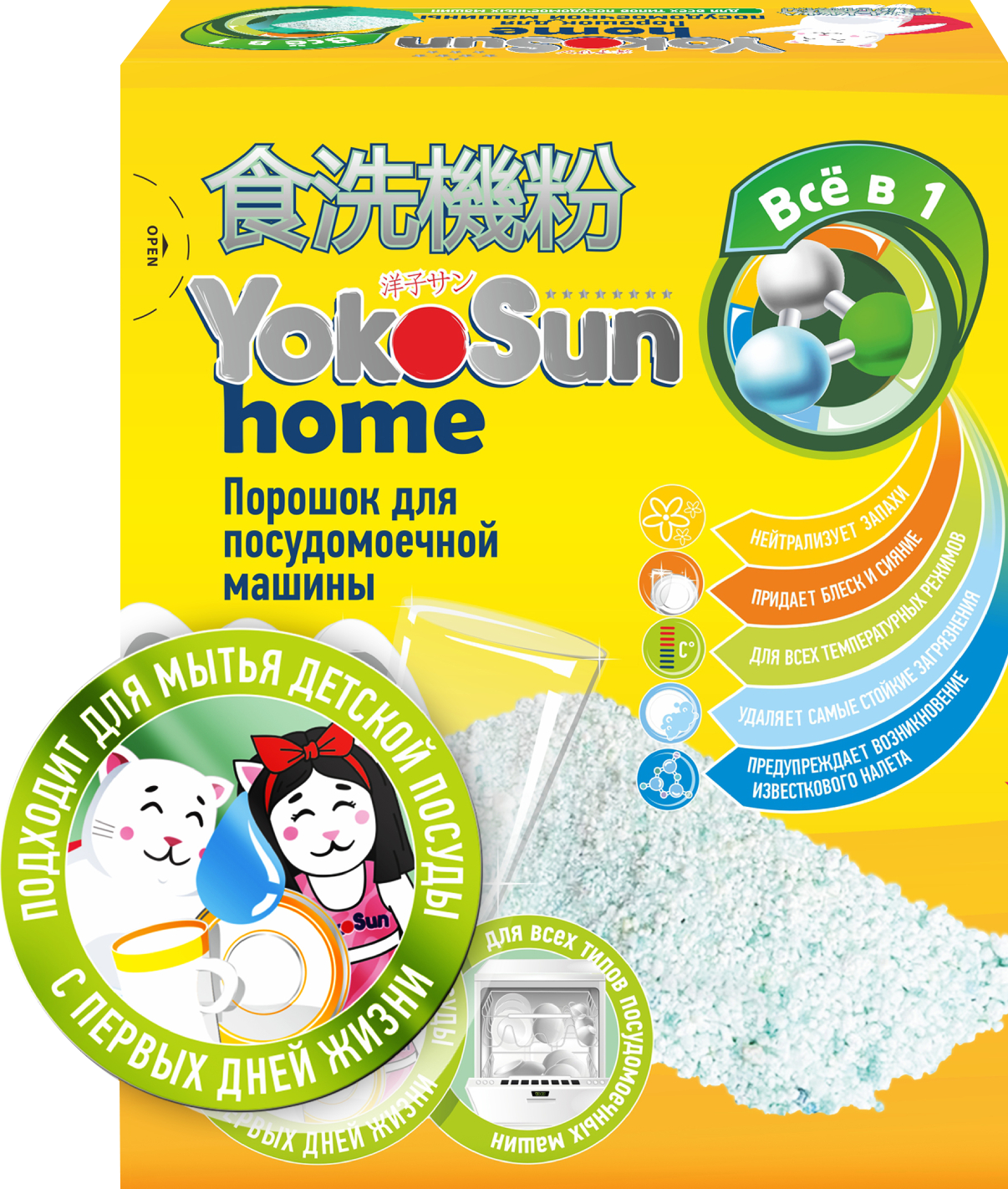 Порошок для посудомоечной машины YokoSun. Специально разработан для домашних посудомоечных машин всех типов. Эффективно и деликатно удаляет самые стойкие загрязнения при любых температурных режимах, не оставляя разводов на поверхности посуды и неприятного запаха. Включает в себя все функции All in 1.