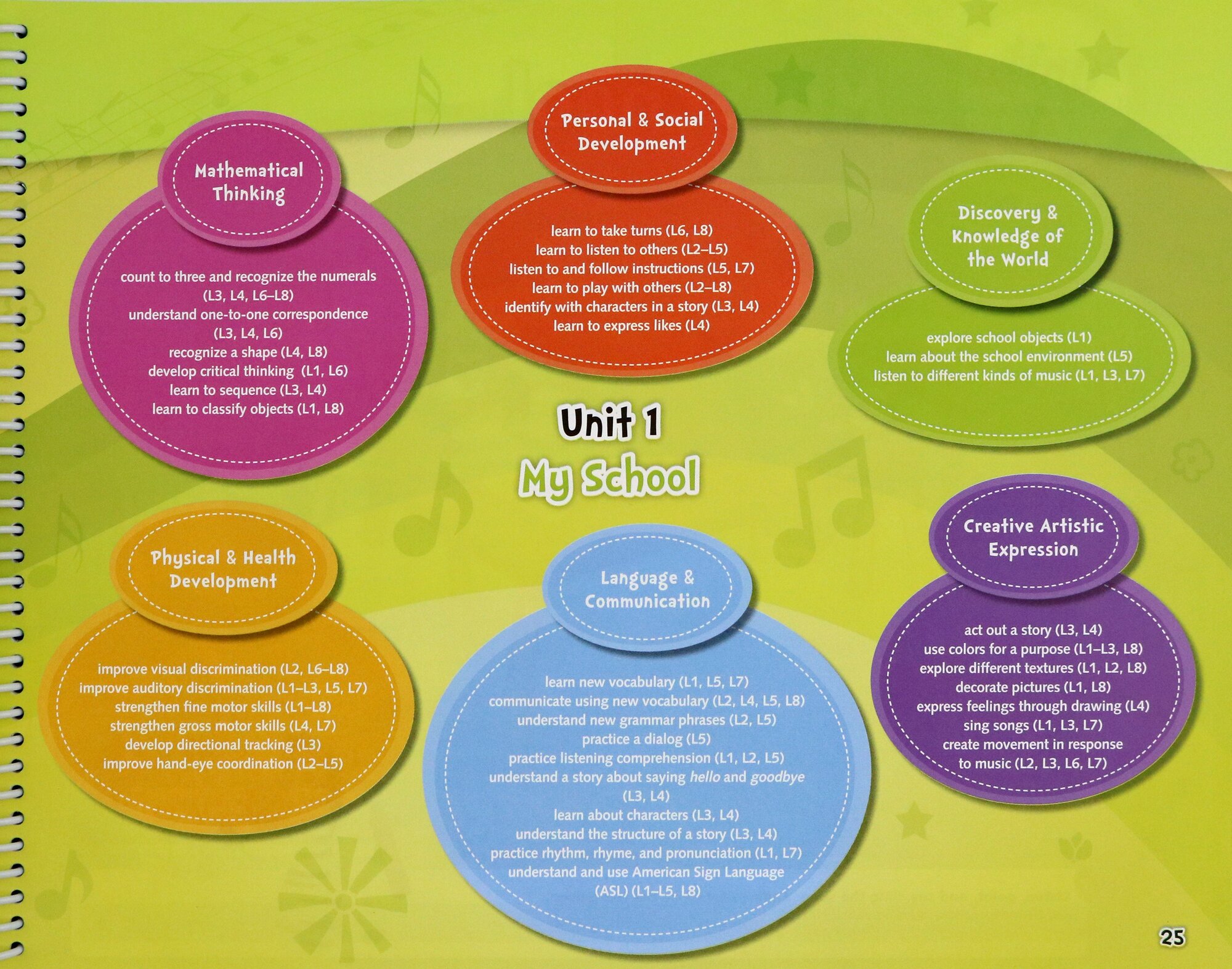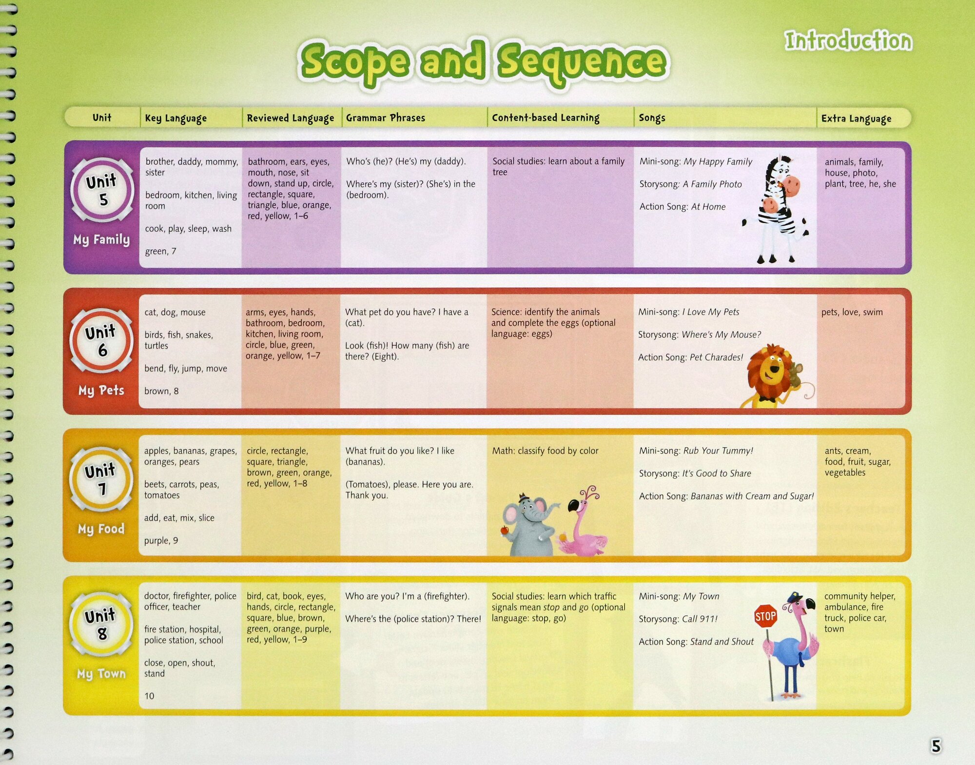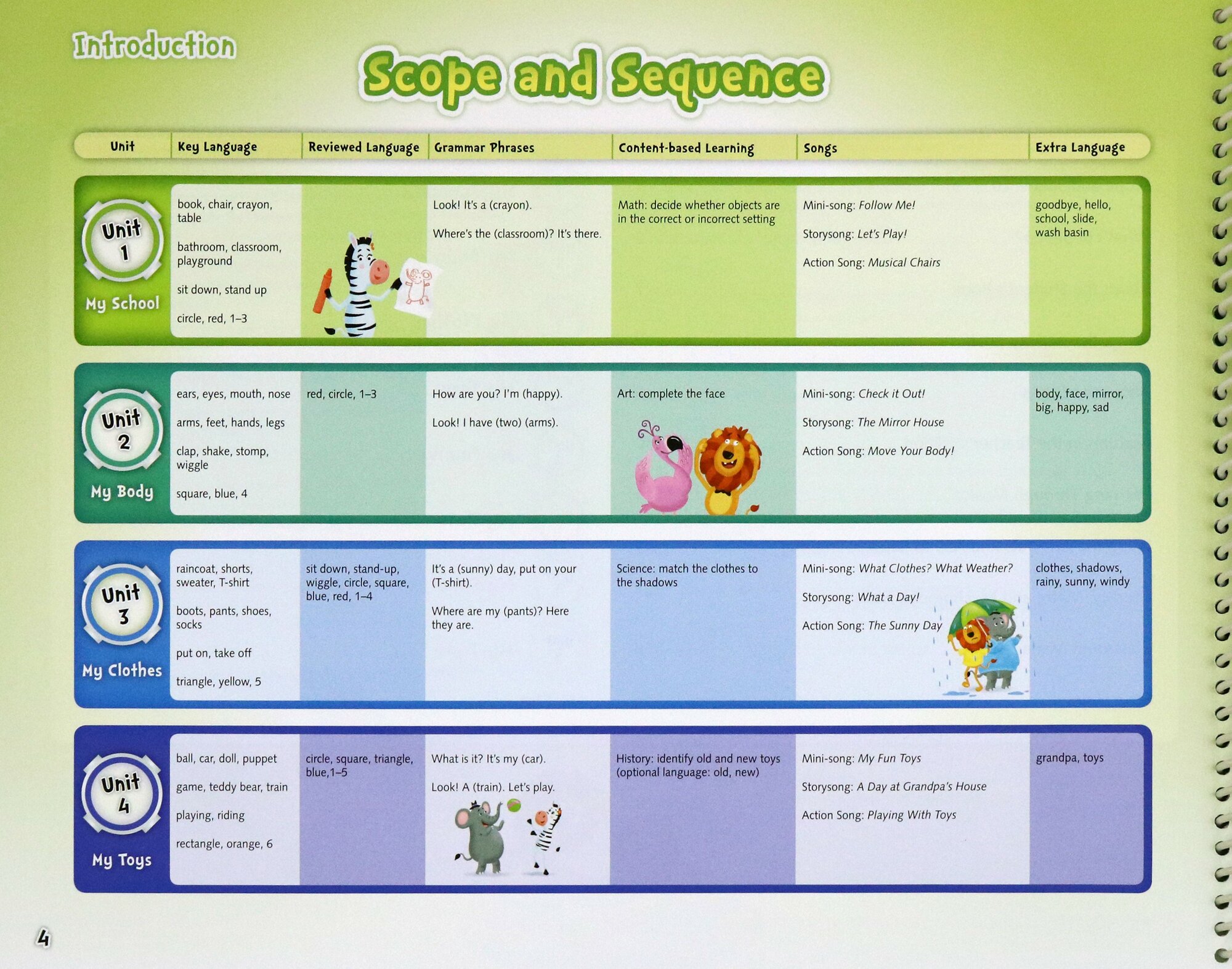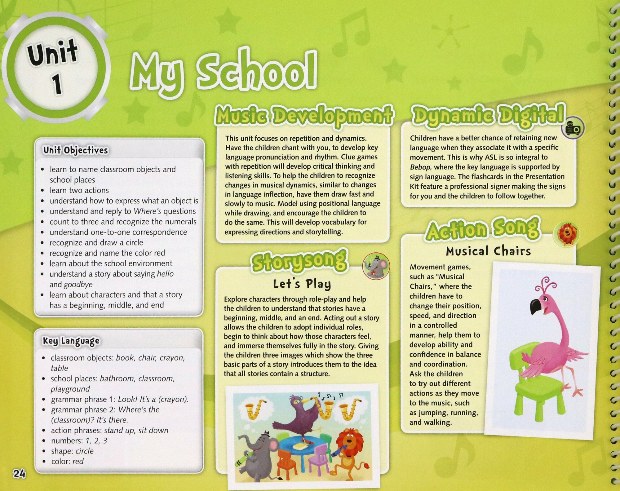 The Bebop Teacher's Editions are all spiral-bound and interleaved with the Student's Books pages. The Book begins with an introduction and is then followed by detailed sections on classroom management, musical development, digital materials, teaching with Total Physical Response and using American Sign Language to support language learning.