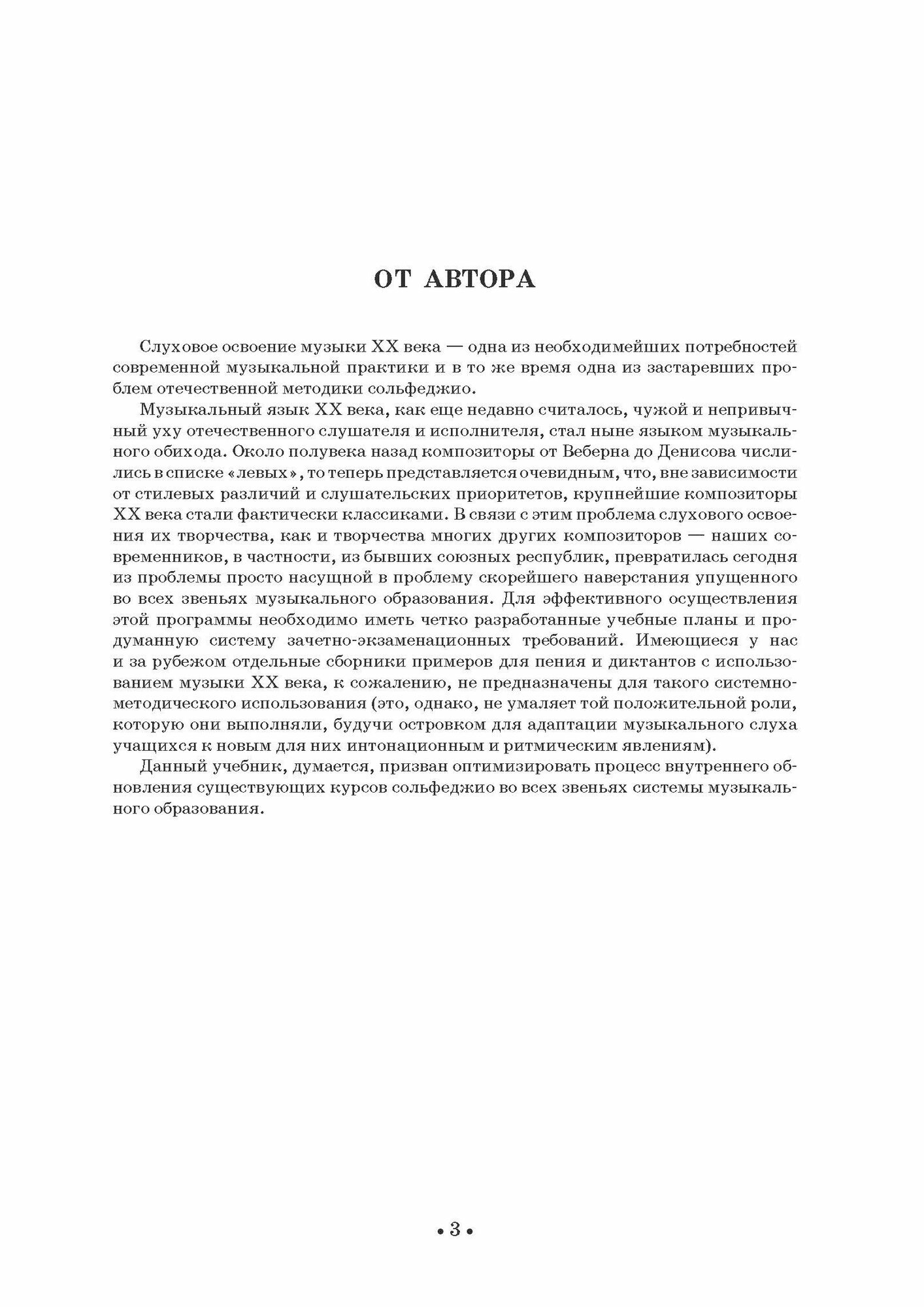 Данное издание представляет собой первый в отечественной и зарубежной практике комплексный учебник по слуховому освоению современной музыки. В нем отобраны и систематизированы характерные трудности освоения музыкального языка ХХ века (его ладовые, мелодические структуры, аккордика, ритмика). Специальное внимание уделено проблемам чтения с листа современного нотного текста.
