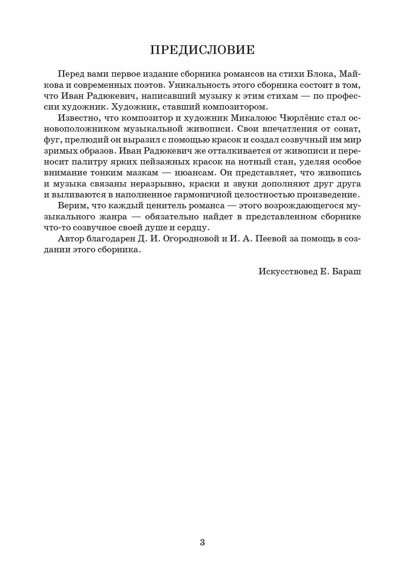 Настоящий сборник состоит из 16 романсов и песен современного художника и композитора Ивана Радюкевича. Вокальные произведения написаны для разных голосов в сопровождении фортепиано и заключают в себе различную степень сложности. Сборник предназначен как для профессиональных исполнителей, так и для широкого круга любителей музыки.