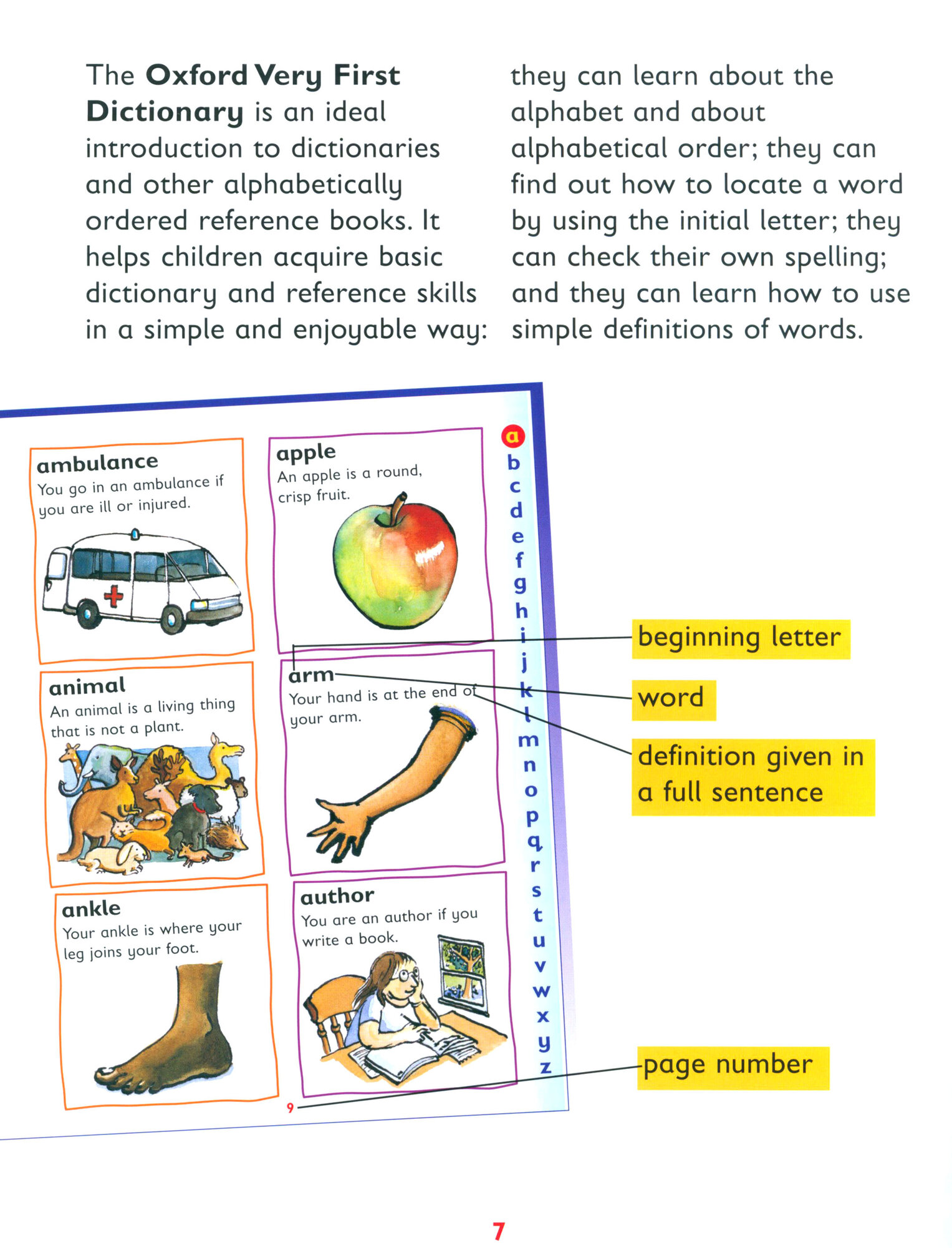 The Oxford Very First Dictionary, with its colourful clear layout and familiar first words, each with a simple definition and illustration, is a fun and easy way for young children to learn how to use a dictionary. An illustrated section at the end on topics such as colours and days of the week provides additional support for early literacy.