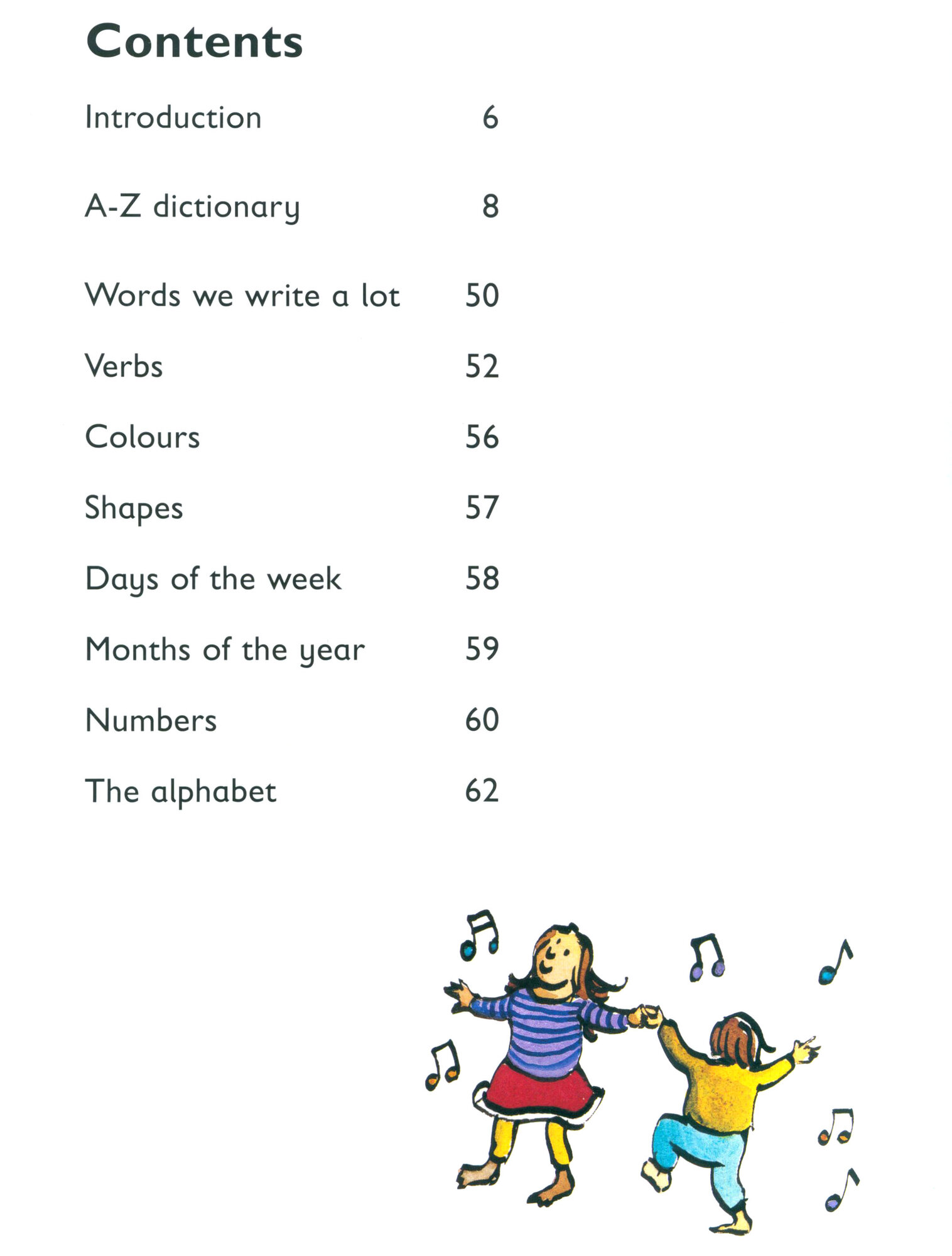 Illustrated section on Words We Write a Lot, Verbs, Colours, Shapes, Days of the Week, Months of the Year, Numbers to 20 and the alphabet
