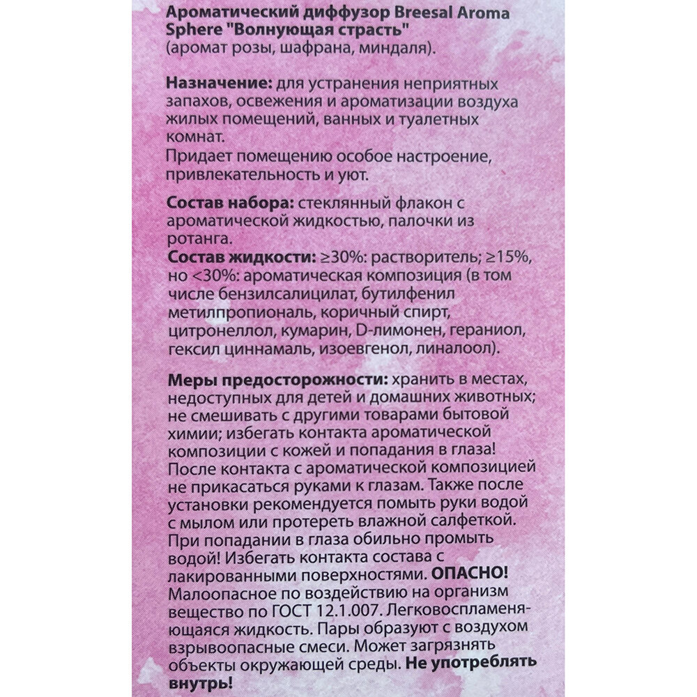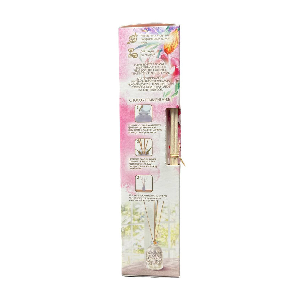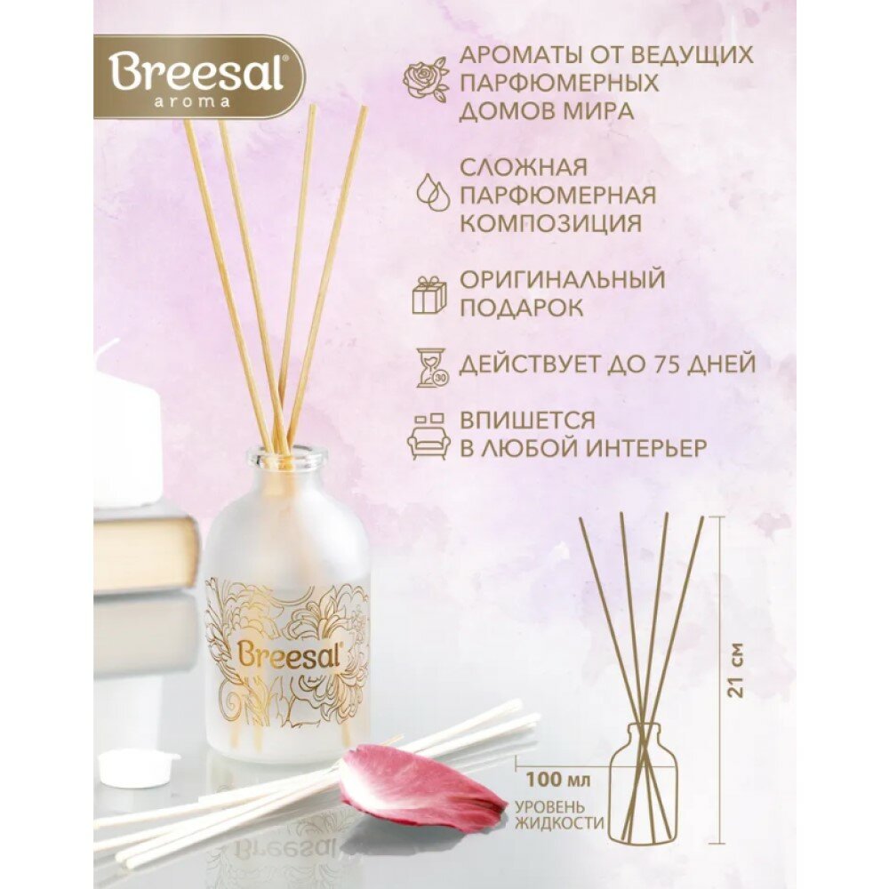 Диффузор ароматический для дома Breesal – это многогранный аромат в стеклянном флаконе с натуральными древесными палочками, который впишется в любой интерьер и создаст в нем особую атмосферу. Изысканная и загадочная композиция «Сладкие грезы» оставит за собой шлейф солнечного и жизнеутверждающего флёрдоранжа вкупе с нотками дымно-теплого ириса и сладостью сочного личи, ощущение радости, легкости и сладкой неги. Просто откройте флакон и опустите палочки в ароматический диффузор для дома. Сделанные из натурального ротанга, они быстро наполнятся жидкостью и будут отдавать аромат медленно и равномерно.