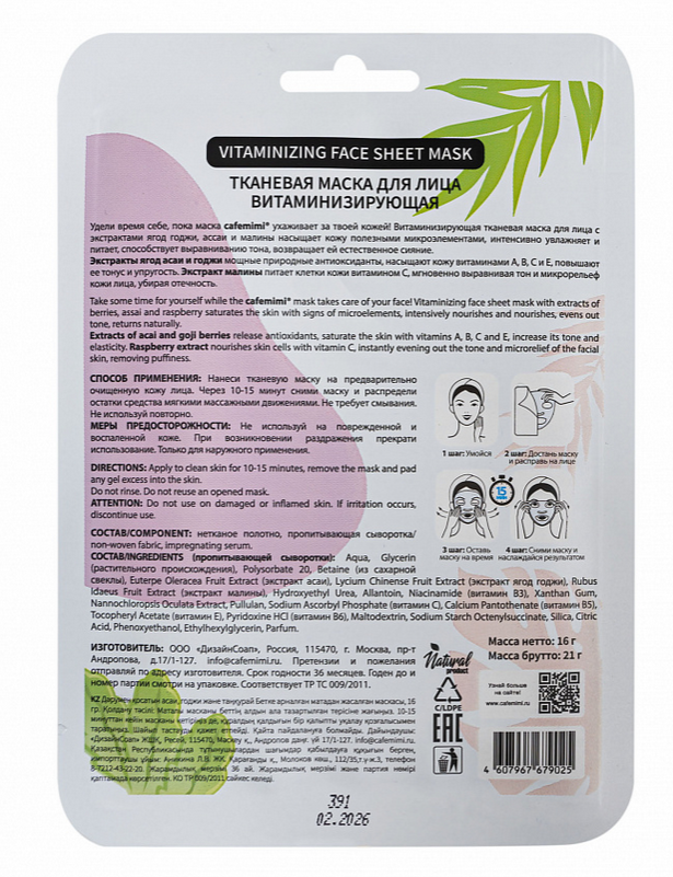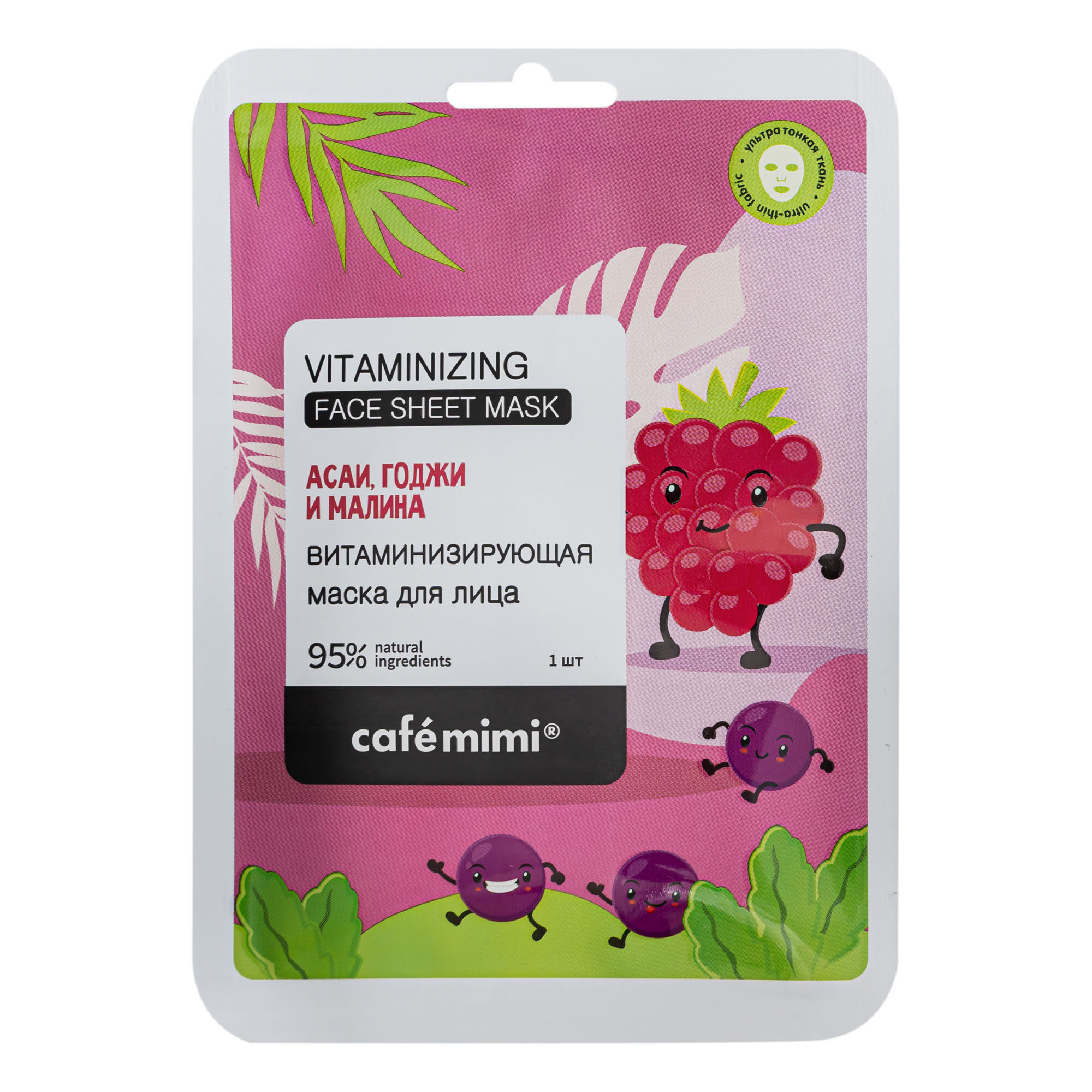 Маска тканевая для лица Cafe Mimi Витаминизирующая Асаи годжи и малина 21 г