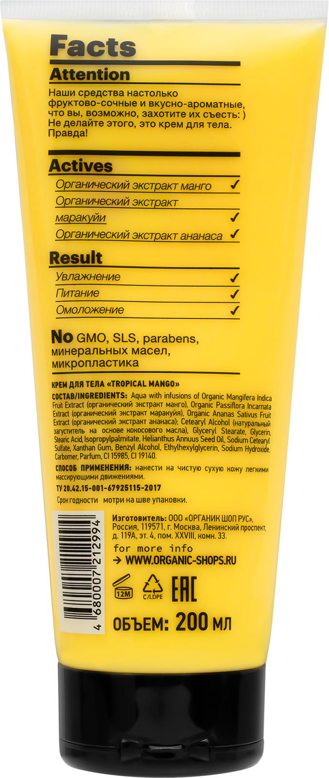 | Состав | Aqua with infusions of Organic Mangifera Indica Fruit Extract (органический экстракт манго), Organic Passiflora Incarnata Fruit Extract (органический экстракт маракуйи), Ananas Sativus Fruit Extract (экстракт ананаса), Organic Butyrospermum Parkii (органическое масло ши), Organic Mangifera Indica Seed Oil (органическое масло манго), Octyldodecanol, Cocoglycerides, Sorbitol, Cetearyl Alcohol, Sodium Stearoyl Glutamate, Benzyl Alcohol, Citric Acid, Parfum, Kathon, CI 19140, CI 15985, Hexyl Cinnamal, Limonene, Linalool |