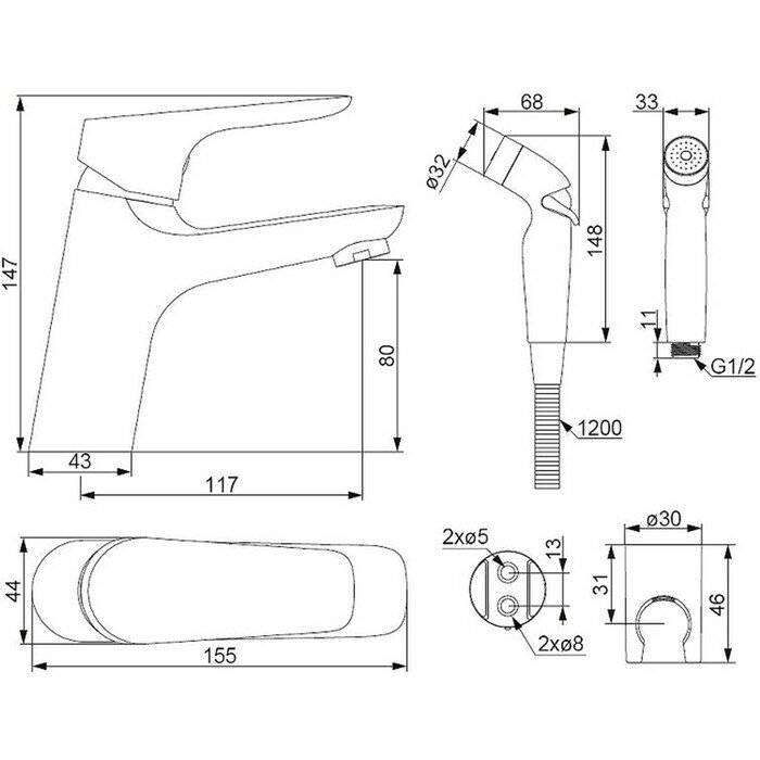 | Оснащение | Душевая лейка / Аэратор / Гибкая подводка / Держатель для душа / Душевой шланг / Крепления |