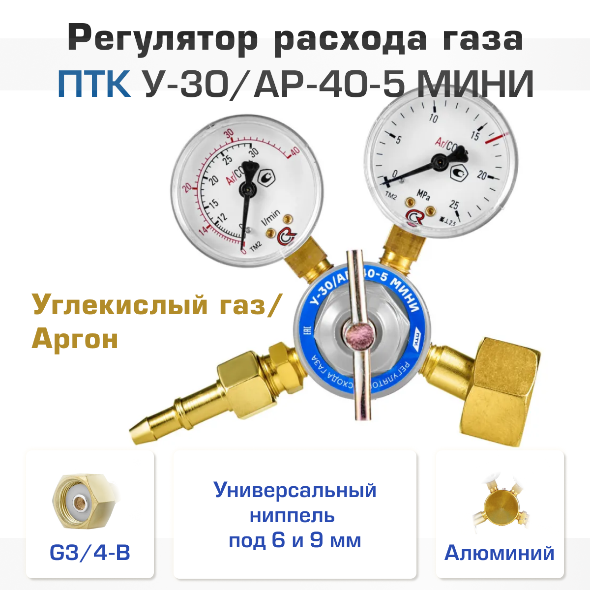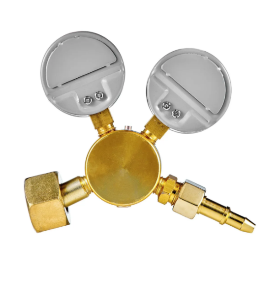 Компактный универсальный регулятор расхода газа с манометром и манометром-расходомером для углекислоты и аргона. Поставляется в комплекте с универсальным ниппелем.