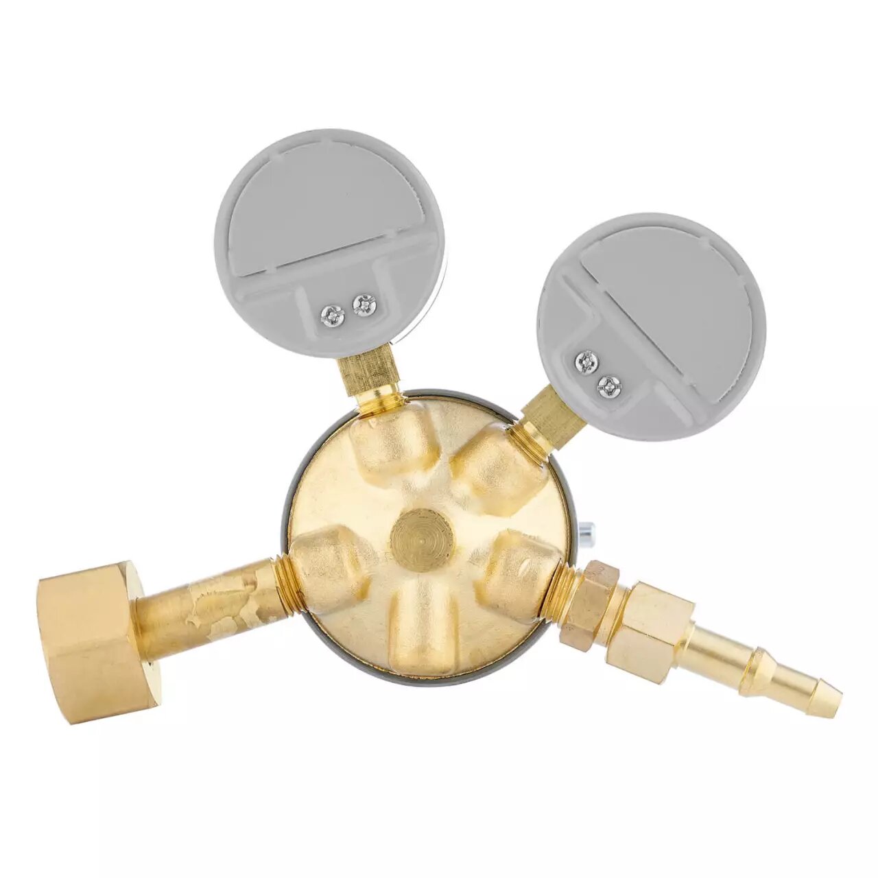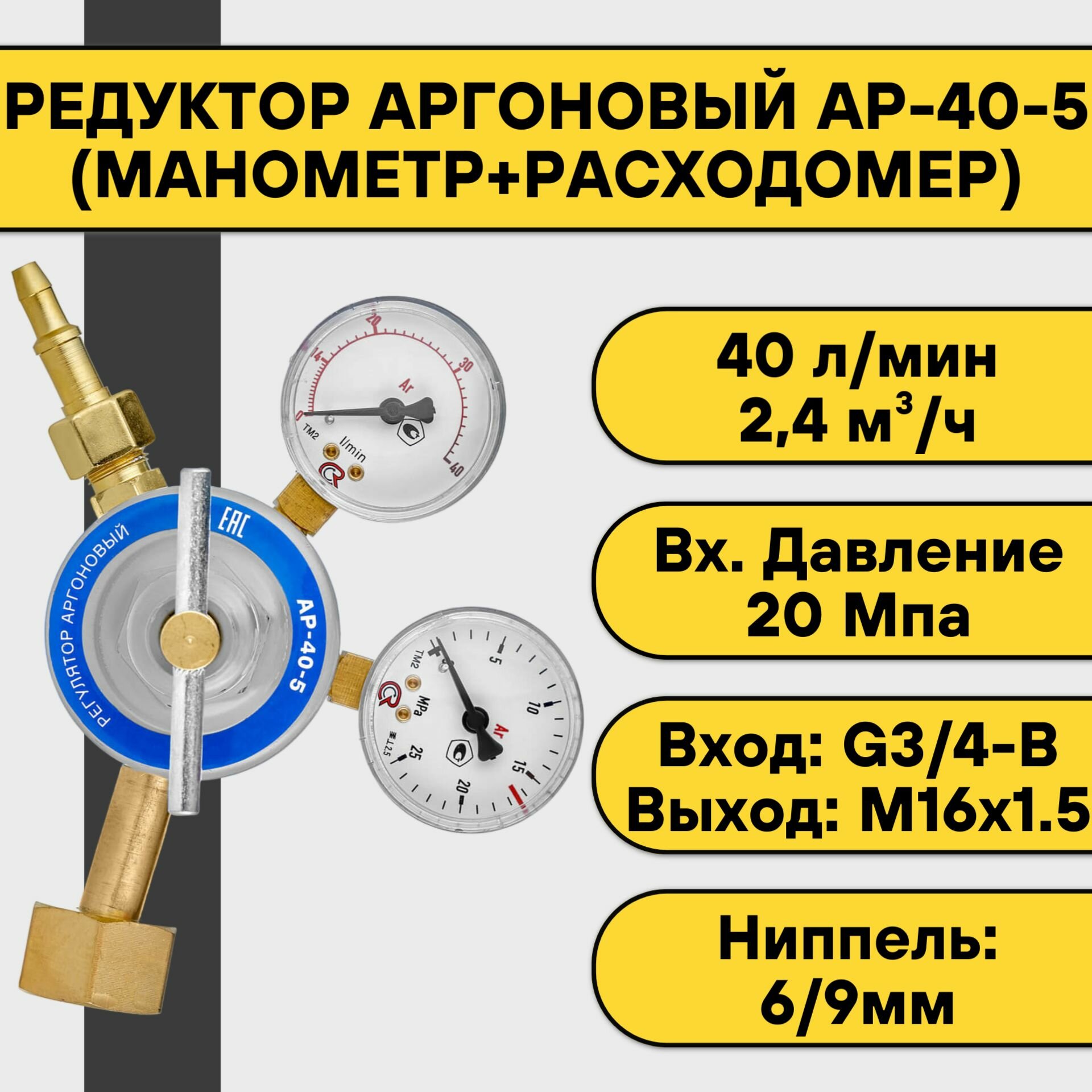 Регулятор расхода газа АР-40-5 предназначен для понижения давления газа и автоматического поддержания постоянным заданного расхода при питании постов и установок в среде защитных газов. Корпус регулятора изготовлен из латуни. Позволяет производить тонкую настройку рабочего давления. Срабатывание предохранительного клапана происходит при давлении в 1,6 МПа. Регулятор используется в цеховом производстве средней интенсивности. Особенности: Регулятор расхода газа укомплектован универсальным ниппелем, что позволяет использовать резинотканевые рукава с внутренним диаметром 6 и 9 мм без дополнительных переходников. Регулятор упакован в индивидуальную картонную коробку, что исключает бой манометров и обеспечивает сохранность комплектации во время транспортировки и хранения на складе. Комплектация: Регулятор расхода газа АР-40-5 в сборе – 1 шт. Руководство по эксплуатации – 1 шт.