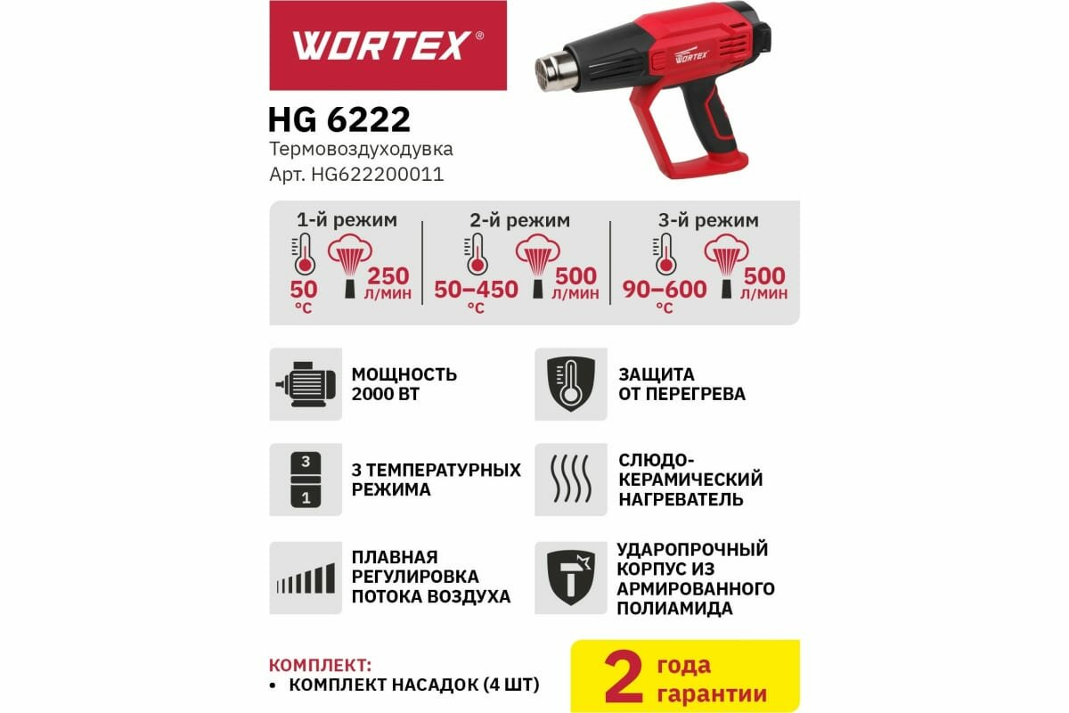 Термовоздуходувка WORTEX HG 6222 в кор. + набор сопл (2000 Вт 3 скор. 90-600 °С плавн. рег.) (HG622200011) (1052556)