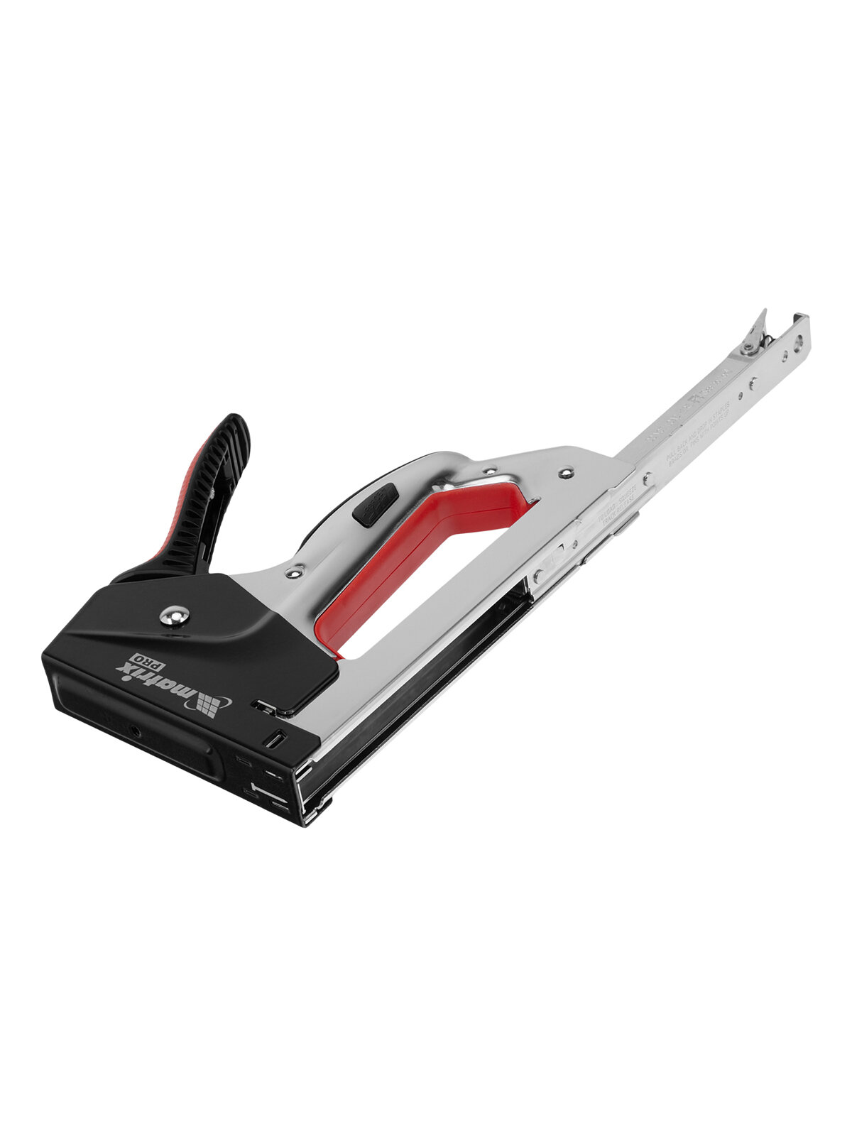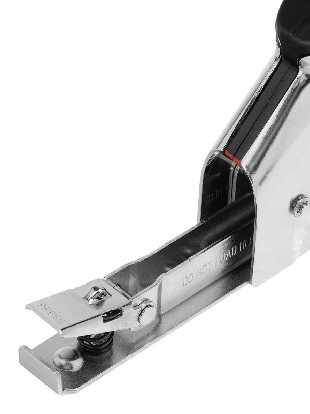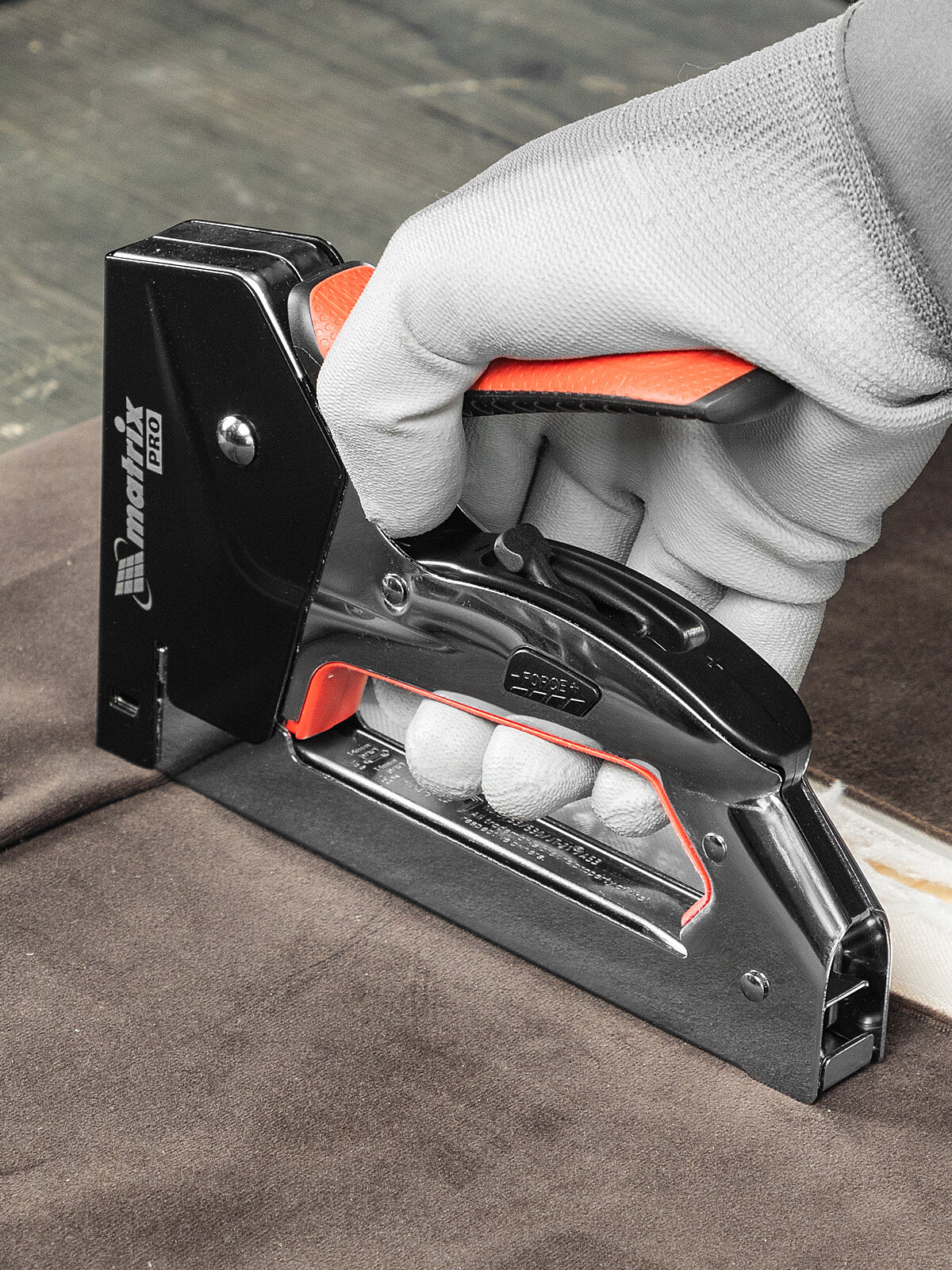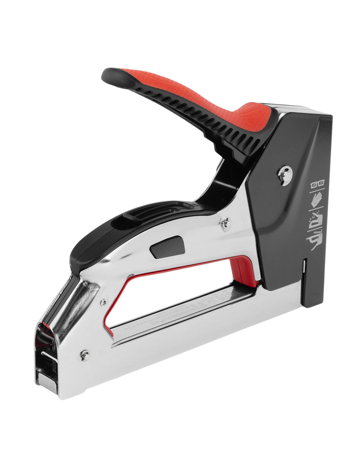 Степлеры предназначены для быстрой фиксации листового материала (оргалита, фанеры, ДСП, ДВП, пленки, утеплителя) к деревянному основанию. Незаменим при сборке мебели, укладке коврового покрытия, фиксации утеплителя, обивке мягкой мебели, а также при багетных работах. Особенности: Изготовлен из стали методом штамповки. Комплектуется крючком для подвеса на ремне. Двухпозиционная регулировка силы удара, для контроля глубины забивания скобы. Преимущества: Защитное покрытие - окрашивание / хромирование.Быстрая загрузка скоб в скобоприемник. Двухкомпонентная рукоятка эргономичной формы для удобства в работе.Комплектация: Степлер мебельный - 1 шт.