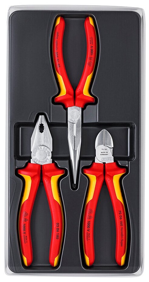 | Комплектация | 1 x 03 06 180 knipex плоскогубцы комбинированные, 1 x 70 06 160 knipex бокорезы, 1 x 26 16 200 knipex длинногубцы с режущими кромками |