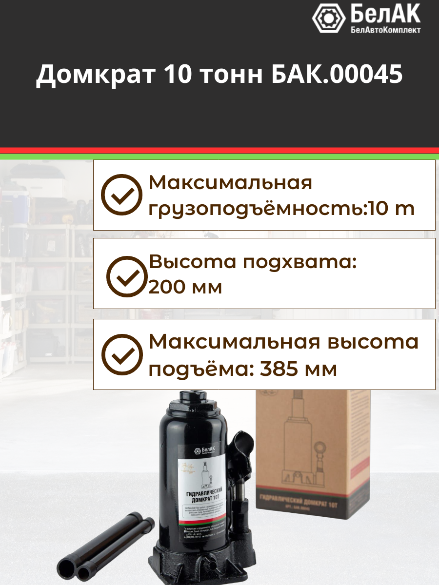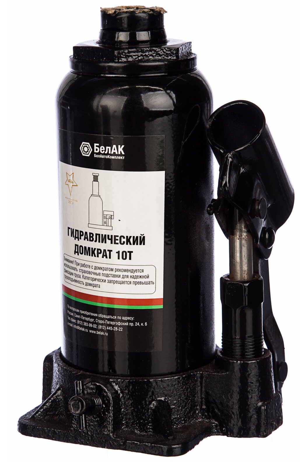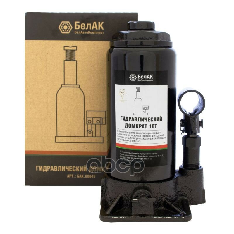 Домкрат гидравлический бутылочный 10 тонн "БелАК" разработан российским производителем «БелАК», награждённым двумя национальными премиями «Автокомпонент года» и «Автоаксессуар года» за высокое качество и надежность выпускаемых домкратов. Продукция «БелАК» соответствуют нормам сертификации ISO9001 и ЕАС.