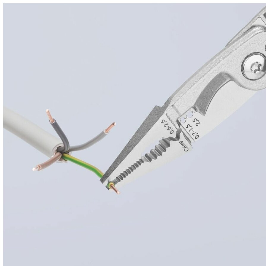 | Прочие особенности и свойства | Клещи хромированные, изолированные ручки из многокомпонентного материала, испытаны на соответствие нормам VDE IEC 60900DIN EN 60900. Клещи с чернением черного цвета, с полированной головкой, ручки с пластмассовым покрытием. Применяются для обхвата плоского и круглого материала, гибки, удаления заусенцев, резки кабеля, удаления изоляции и опрессовки концевых гильз. Одни клещи совмещают в себе сразу 6 функций. Гладкие захватные губки для захвата отдельных жил без их повреждения. Профилированные захватные губки и выемка для захвата плоского и круглого материала. Отверстия для удаления изоляции для проводов 0,7–1,5 мм? и 2,5 мм?. Опрессовочное гнездо для концевых гильз 0,5–2,5 мм?. Ножницы для резки с прецизионными лезвиями (индуктивной закалки) для медного и алюминиевого кабеля до 5 x 2,5 мм? / O 15 мм. Специальная инструментальная сталь особого качества, кованая, закалённая в масле. Медный кабель, многопроводный O 15 мм / 50 мм? Диаметр для отдельных жил 0,75 - 1,5 + 2,5 мм? Диапазон 0,5-2,5 мм? AWG 1/0 Хромированные Многокомпонентные чехлы VDE |