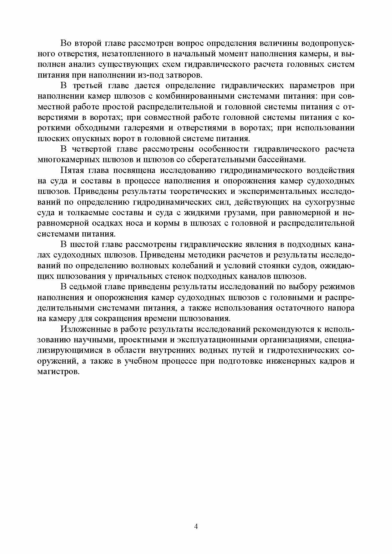 Приводятся результаты теоретических, лабораторных и натурных исследований по изучению гидравлических параметров систем питания судоходных шлюзов, гидродинамического воздействия на суда в процессе наполнения и опорожнения камер и разработке безопасных режимов шлюзования.