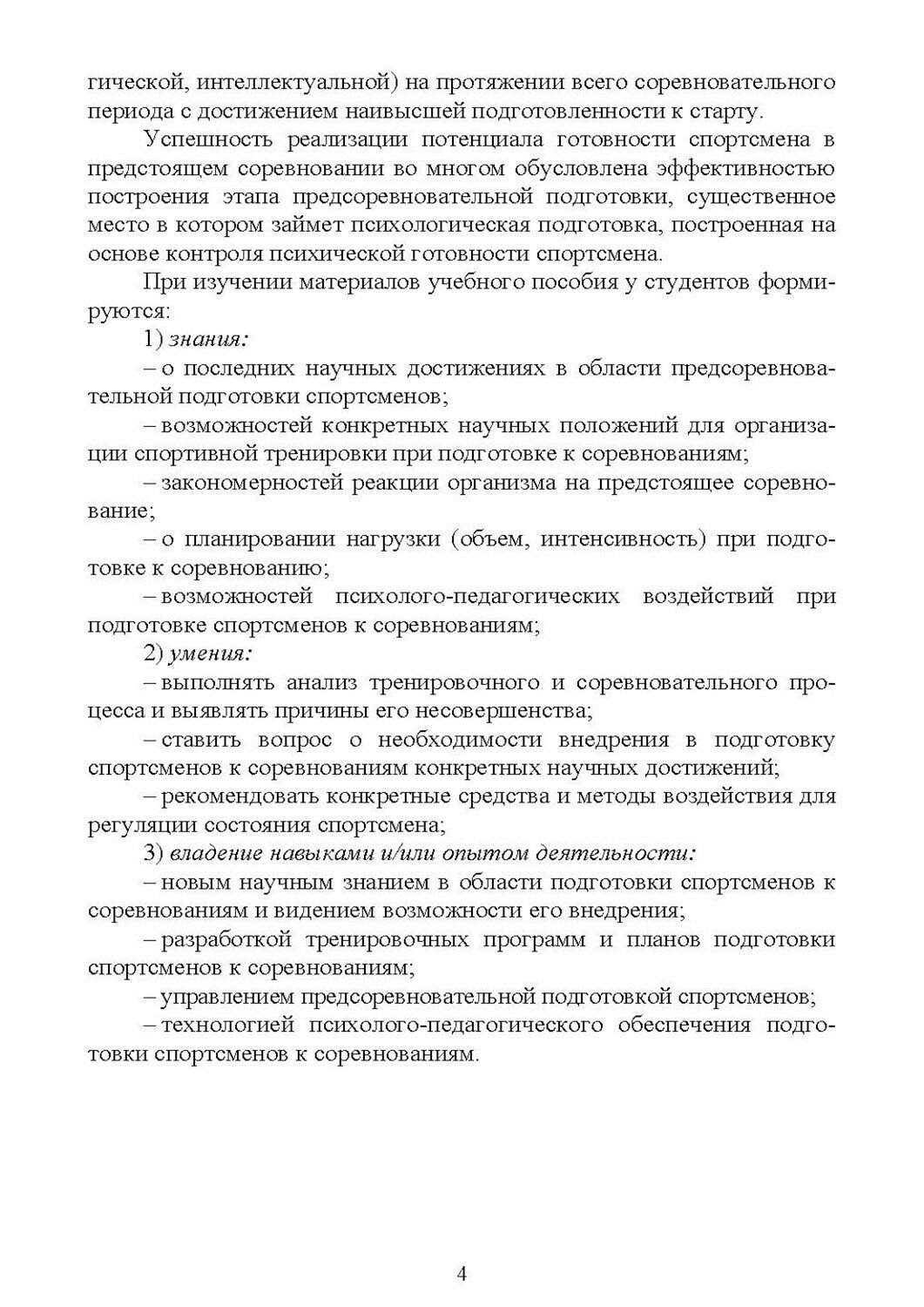 В учебном пособии раскрываются значение, содержание, задачи, средства, методы предсоревновательной подготовки спортсменов высокой квалификации. Представлены структура предсоревновательного мезоцикла и содержание микроциклов. Овладение студентами представленного в пособии учебного материала расширит представление о содержании и назначении предсоревновательной подготовки спортсменов.