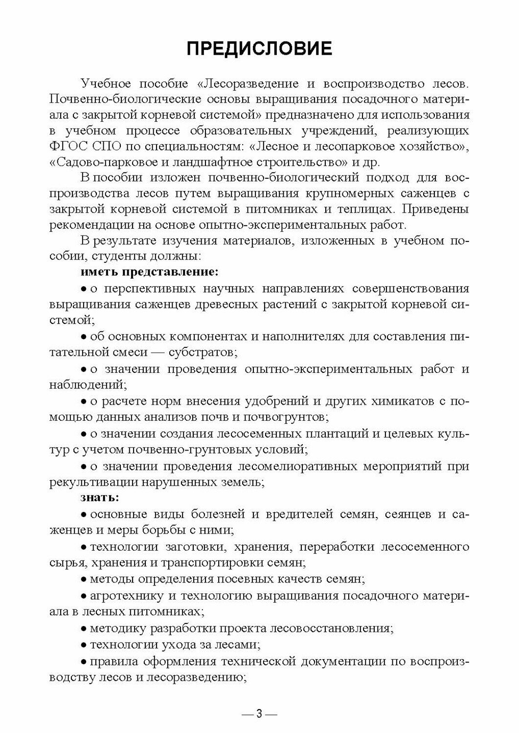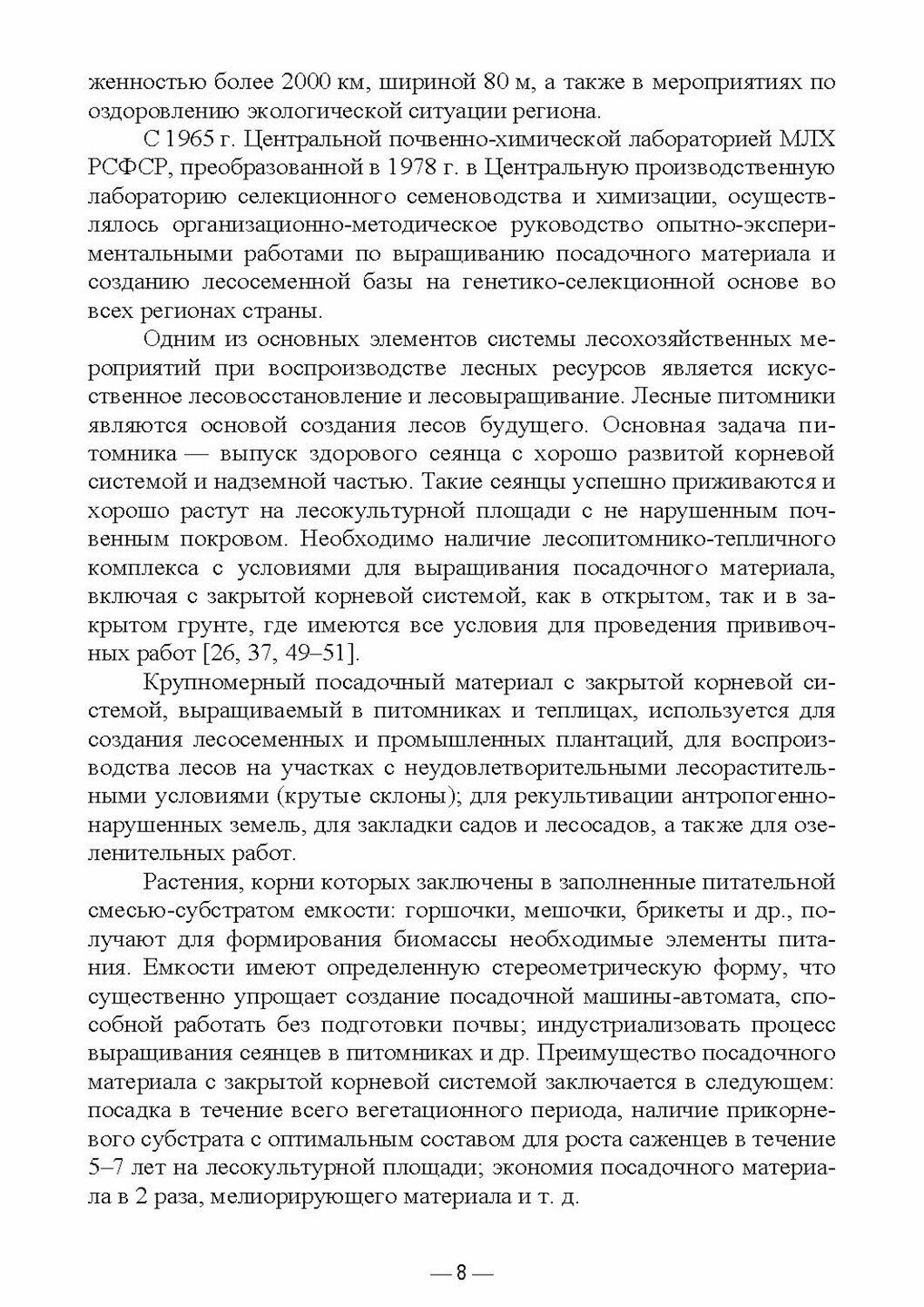 выращивания сеянцев и саженцев, как на открытом грунте, так и в тепличных условиях, разработанные на основании экспериментальных данных, проведенных с учетом лесорастительных условий почв. Много внимания уделено подбору и подготовке компонентов для подготовки питательной смеси — субстратов для производства брикетированных саженцев, подбору ассортимента древесных пород и кустарников и почвенным условиям лесокультурной площади, минеральному питанию сеянцев и саженцев древесных пород. Даны практические рекомендации по технологии выращивания посадочного материала с закрытой корневой системой, включая привитые, для закладки лесосеменных плантаций, искусственных лесов на площадях с неблагоприятными лесорастительными условиями, загрязненных и подверженных стихийным бедствиям земельных участков, садово-паркового и ландшафтного строительства.