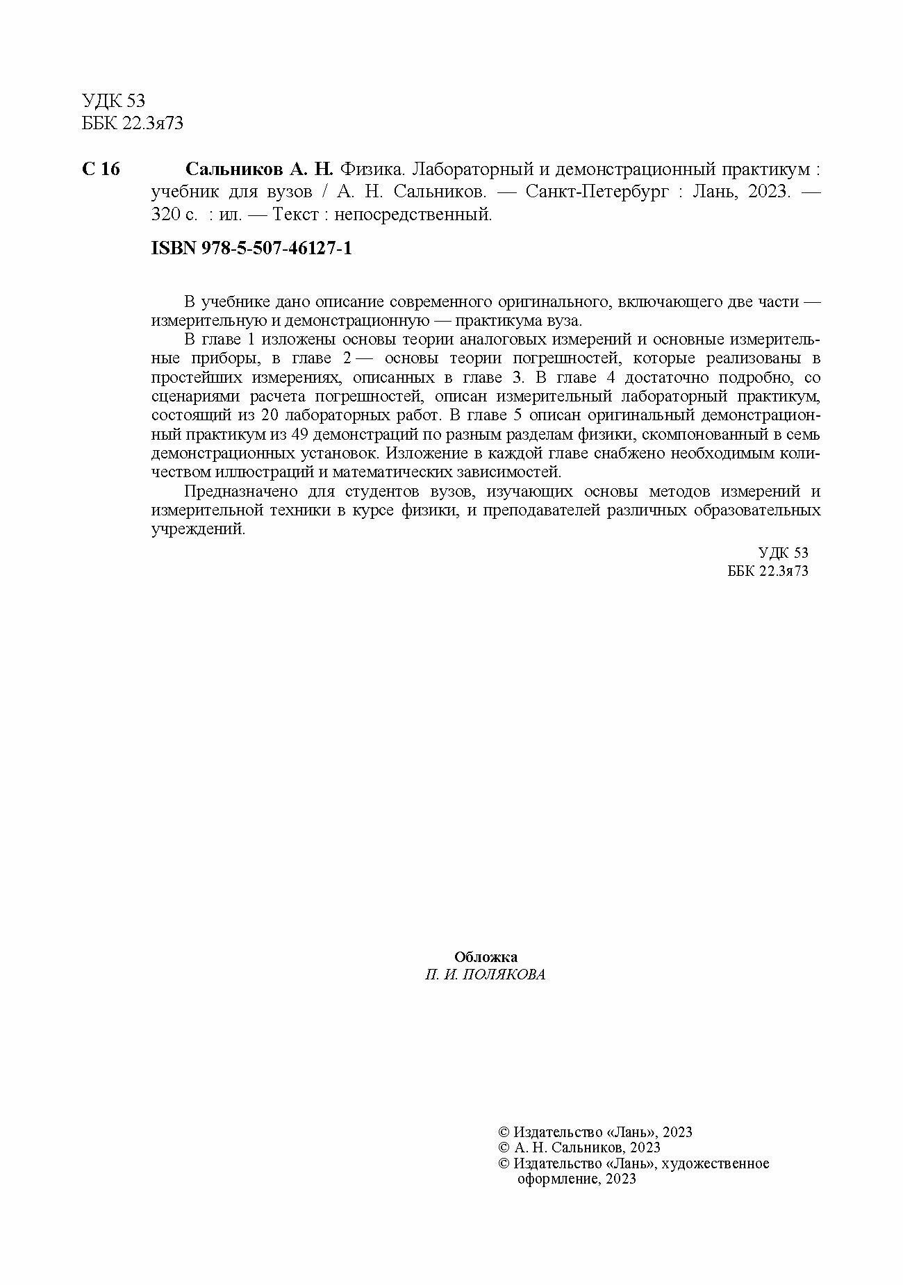 Физика. Лабораторный и демонстрационный практикум. Учебник для вузов (А. Н. Сальников); Издательство ЛАНЬ, 2023
