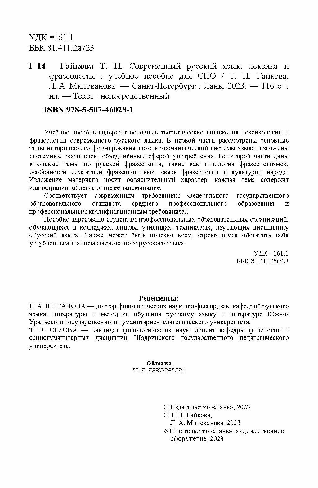 Современный русский язык. Лексика и фразеология. Учебное пособие для СПО (Т. П. Гайкова); Издательство ЛАНЬ, 2023