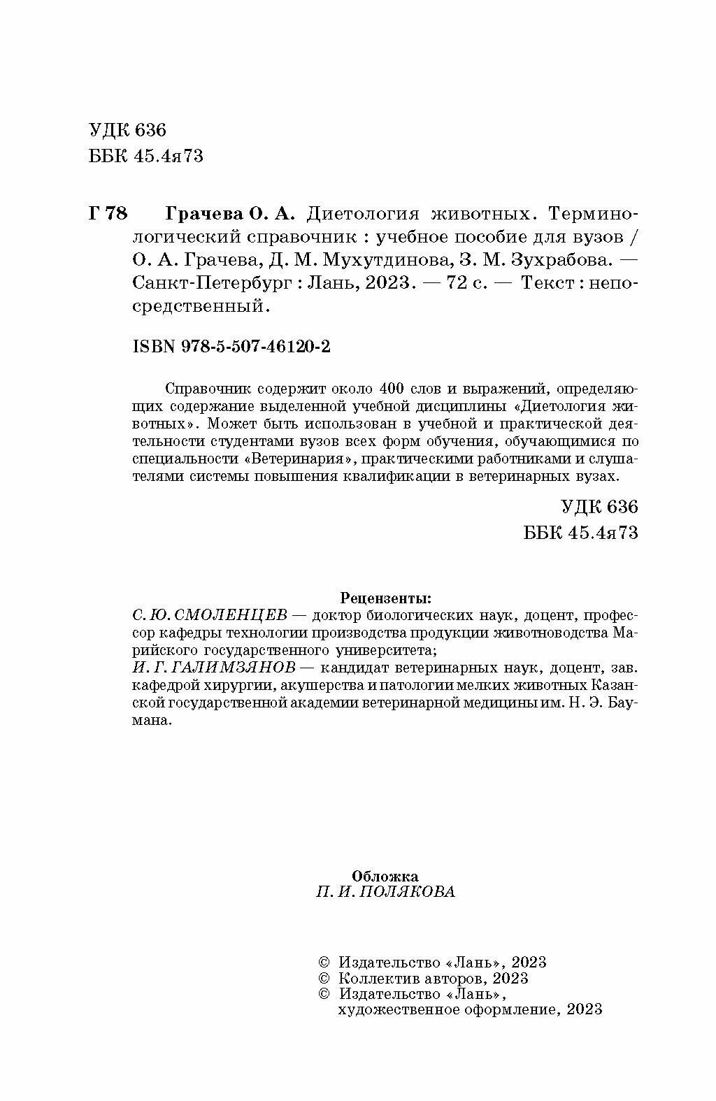 Диетология животных. Терминологический справочник. Учебное пособие для вузов (Грачева Ольга Анатольевна, Мухутдинова Дина Мингалиевна, Зухрабова Зульфия Мирзабековна); Лань, 2023