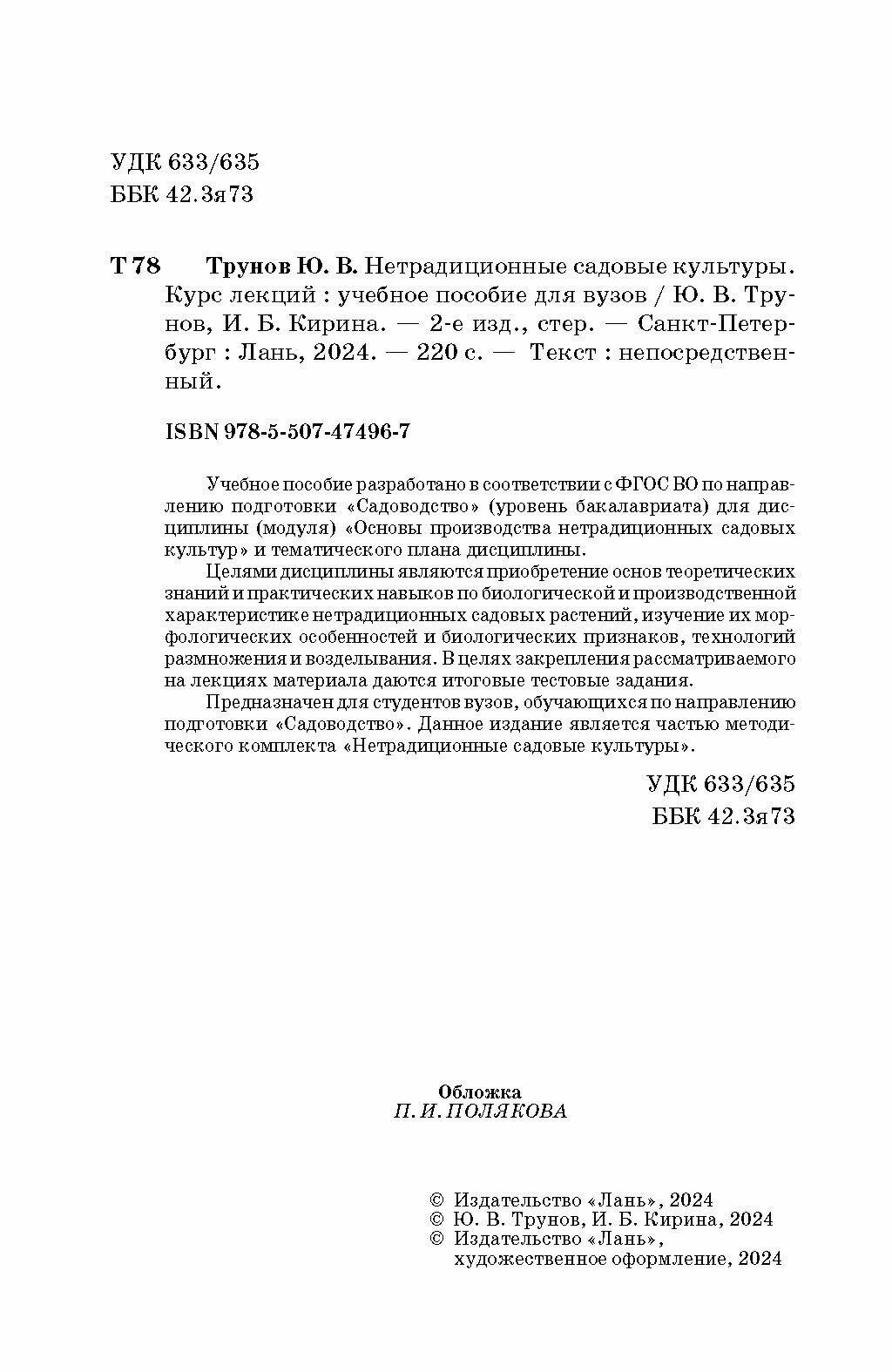 Нетрадиционные садовые культуры. Курс лекций. Учебное пособие для вузов (Трунов Юрий Викторович, Кирина Ирина Борисовна); Лань, 2023