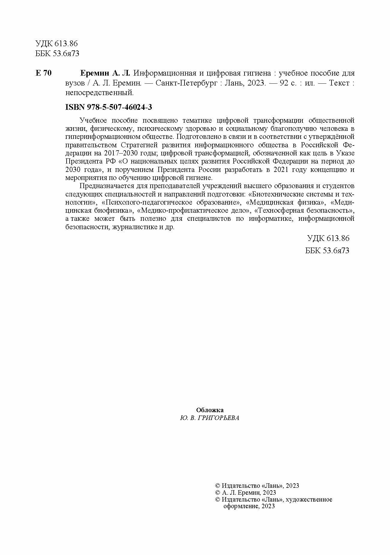 Информационная и цифровая гигиена. Учебное пособие для вузов (Еремин Алексей Львович); Лань, 2023
