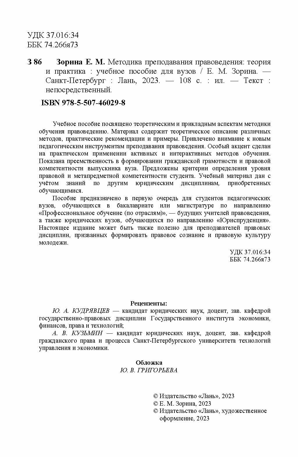 Методика преподавания правоведения. Теория и практика. Учебное пособие для вузов (Елена Михайловна Зорина); Издательство ЛАНЬ, 2024