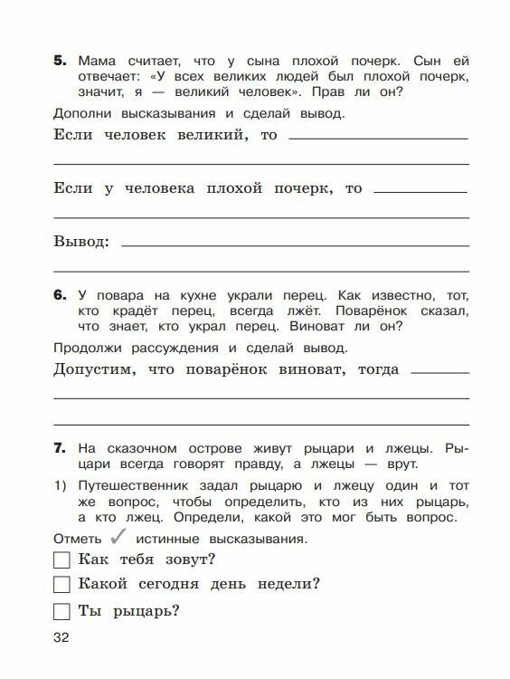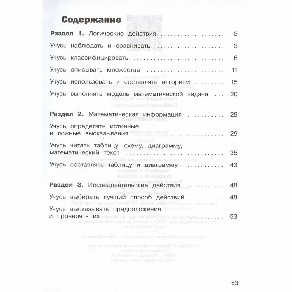 Пособие направлено на развитие логического и алгоритмического мышления, метапредметных умений обучающихся. Содержит систему заданий, направленную на овладение разными спо-собами решения логических задач: рассуждение, моделирование с помощью рисунков и схем, составление таблиц и др.
