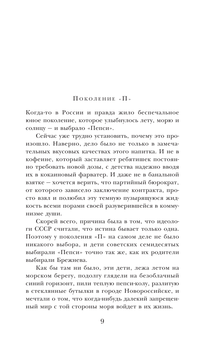 Молодой парень Вавилен Татарский полагает, что ему известно о рекламе все — ведь именно он ее создает. Или нет? Или это реклама сама создает себя, реальность и даже некоторых хорошо известных вам людей?