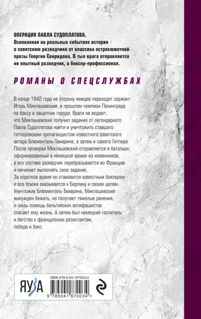 Операция Павла Судоплатова. Основанная на реальных событиях история о советском разведчике от классика остросюжетной прозы Георгия Свиридова. В тыл врага отправляется не опытный разведчик, а боксер-профессионал.