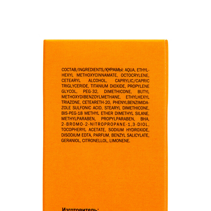 | Состав | вода, этилгексилметоксициннамат, октокрилен, цетеариловый спирт,каприлик/каприк триглицериды, диоксид титана, пропиленгликоль, ПЭГ-32, диметикон, бутилметоксидибензоилметан, этилгексилтриазон, цетеарет-20, фенилбензимидазолсульфокислота, стеарилдиметикон, бис-ПЭГ-18 метиловый эфир диметилсилан, метилпарабен, пропилпарабен, БОА, 2-бром-2-нитропропан-1,3-диол, витамин Е (токоферол ацетат), гидроксид натрия, динатрия ЭДТА, парфюмернаякомпозиция, гидроксицитронеллаль, бензилсалицилат, гераниол,бутилфенилметилпропионал, цитронеллол, лимонен. |