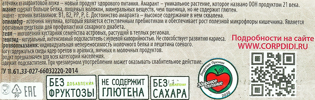 | Состав | мука амарантовая грубого помола, мука рисовая грубого помола, мука кукурузная грубого помола,топинамбур сушеный, соль, витаминная смесь, сливочная начинка (жир растительный ,подсластитель изомальт, сыворотка молочная, мальтодекстрин, сухое молоко, порошок рожкового дерева, подсластитель-экстракт стевии (стевиозид), эмульгатор-лецитин соевый, ванилин), кондитерская глазурь (заменитель кондитерского жира лауриновый, какао-порошок, мальтодекстрин, сыворотка молочная, подсластитель-изомальт, порошок плодов рожкового дерева, порошок топинамбура, микрокристаллическая целлюлоза, подсластитель-экстракт стевии (стевиозид), эмульгатор-лецитин соевый, ванилин) |