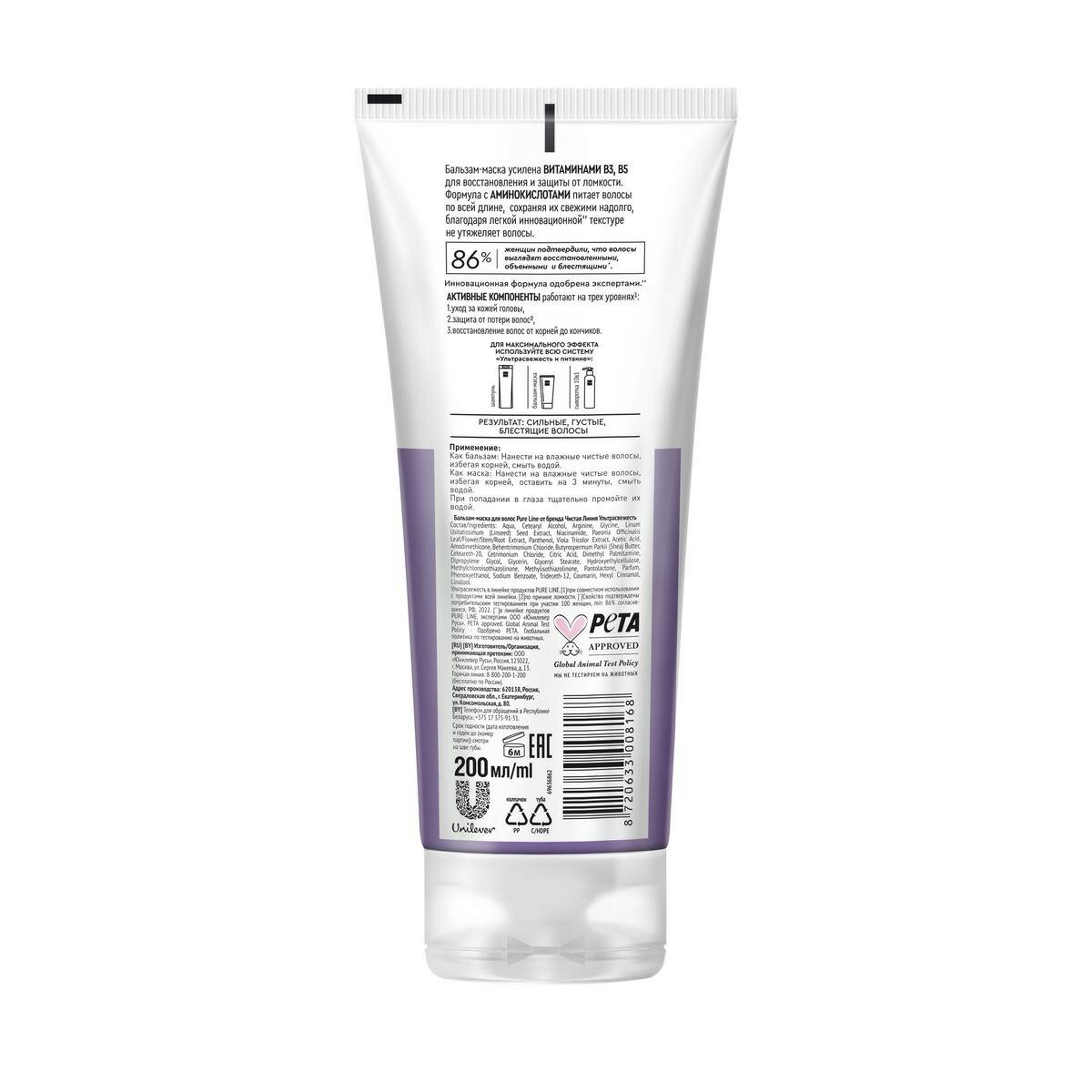 Бальзам-маска для волос Чистая Линия Ультрасвежесть и питание без утяжеления против секущихся кончиков 200 мл