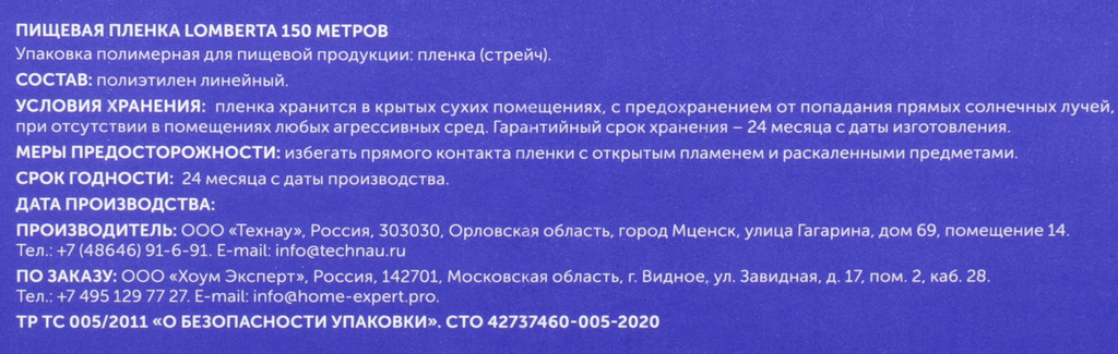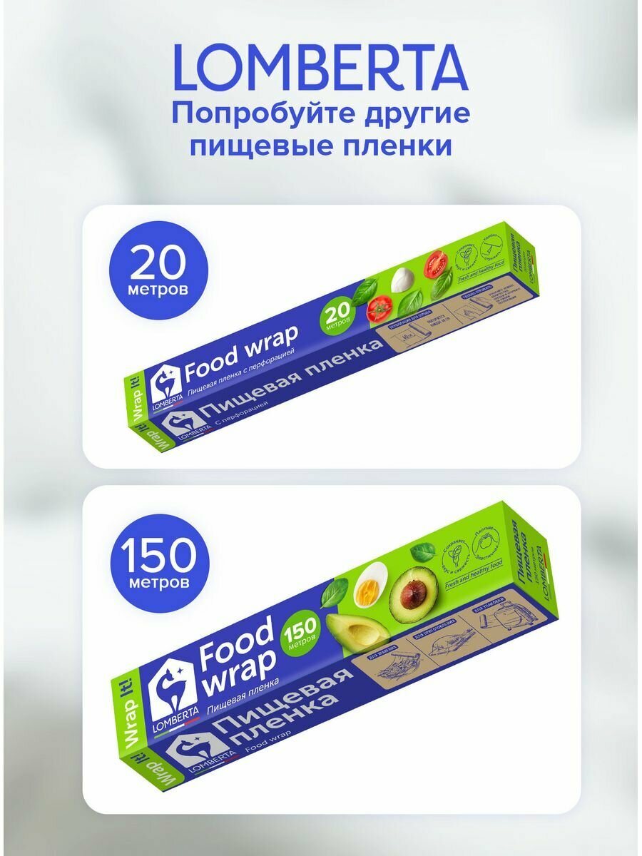 Пленка пищевая Lomberta предназначена для хранения и упаковки продуктов. Сохраняет свежесть и полезные свойства продуктов, позволяет длительно хранить продукты питания. Предотвращает смешивание запахов в холодильнике и высыхание, а также подходит для заморозки продуктов. Легко отматывается и прилипает, предназначена для максимально герметичной упаковки и хранения продуктов. Высокая плотность пленки предотвращает приобретение или распространение посторонних запахов.