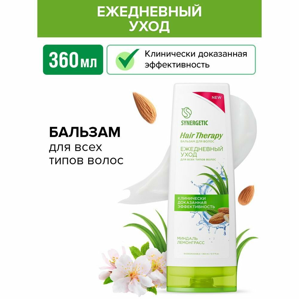 Бальзам для волос SYNERGETIC "Ежедневный уход" HAIR THERAPY - эффективное и безопасное средство для ухода за всеми типами волос. Формула бальзама с натуральными компонентами оказывает комплексное воздействие на структуру волос. Кондиционирующий комплекс с мягким увлажнителем изомератом сахарида эффективно ухаживает за волосами, придавая им жизненную силу и блеск.Масла кокоса и миндаля питают, укрепляют и увлажняют волосы, способствуя восстановлению их природной мягкости и эластичности. Экстракт лемонграсса обладает освежающим и тонизирующим эффектом, помогает улучшить структуру волос и придать им здоровое сияние.Натуральный пребиотик инулин в сочетании с пантенолом обеспечивает длительный кондиционирующий эффект и стимулирует восстановление кератиновых волокон, придавая волосам гладкость и шелковистость, облегчая расчесывание. Эффективность бальзама при регулярном использовании подтверждена аккредитованным испытательным центром.