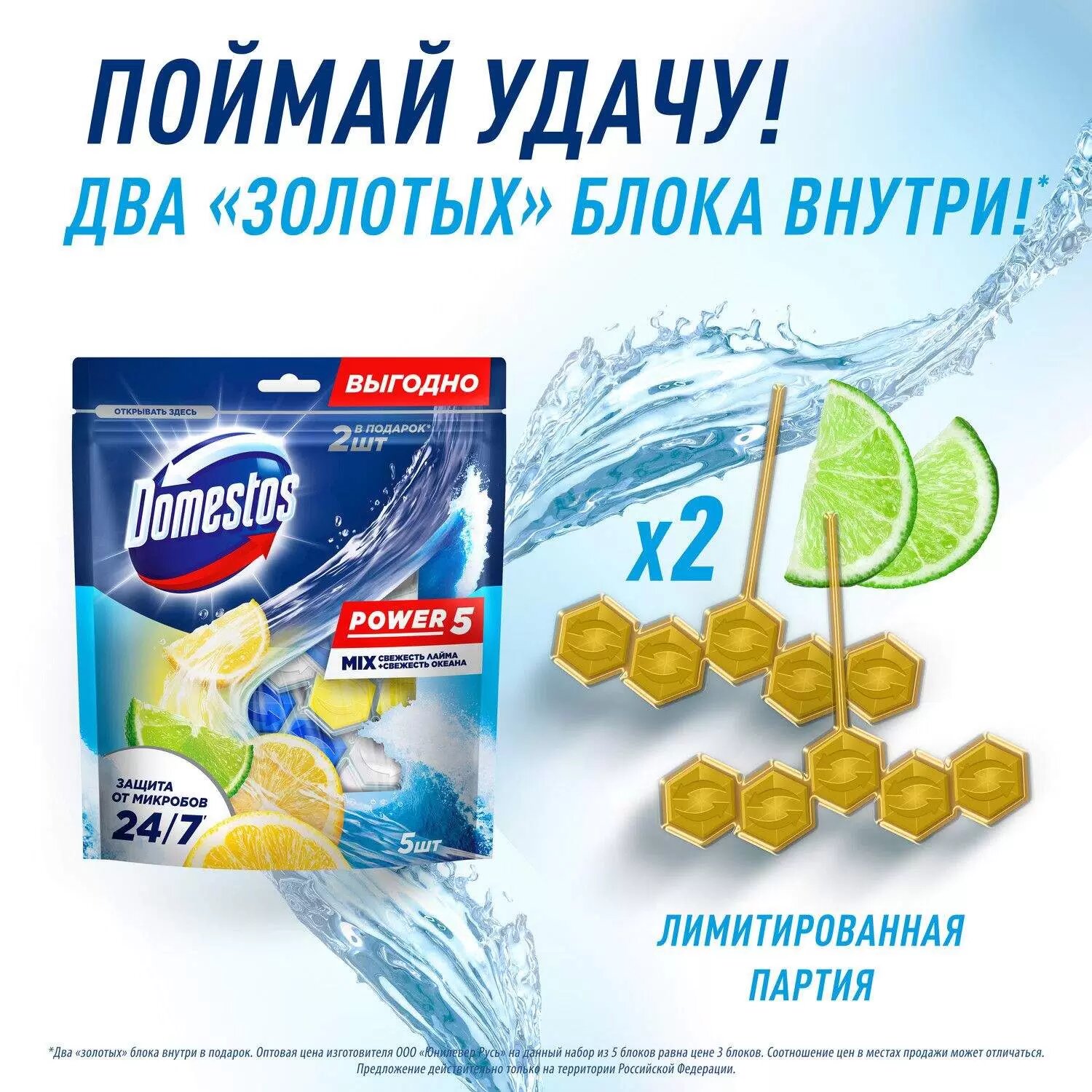 Сервис сравнения цен СкидкаГИД предлагает сравнить цены на товар «Блок для унитаза Domestos Power 5 Свежесть лайма и океана 5 шт»