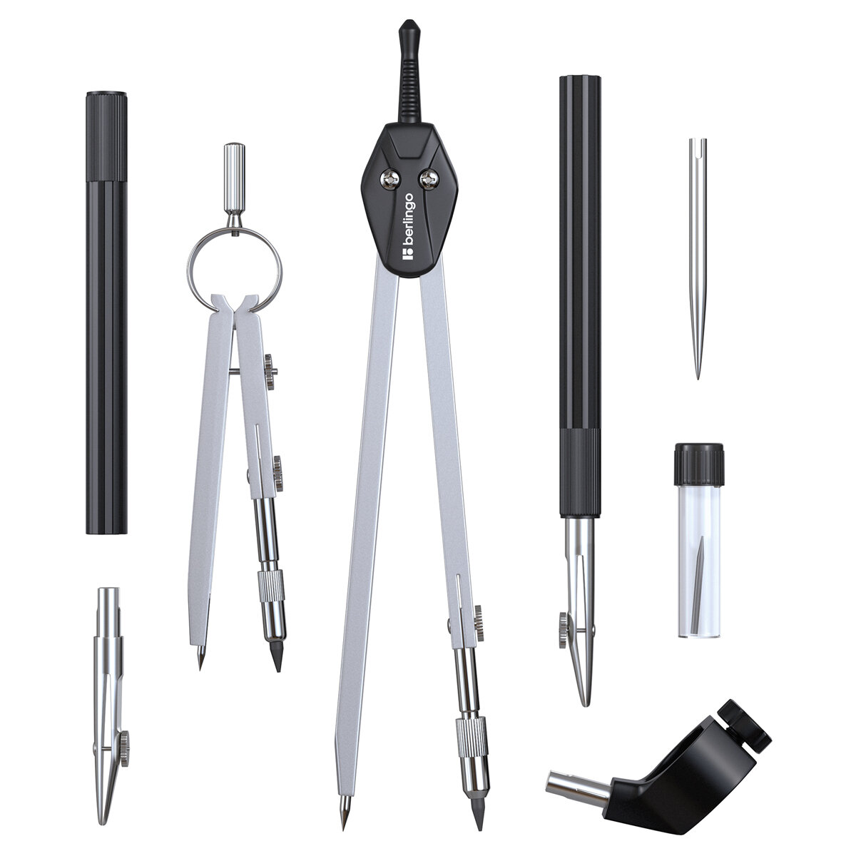 В состав набора входят : циркуль, пенал со сменным грифелем, насадка с универсальным держателем, рейсфедерная вставка, рейсфедер, точечная насадка, кронциркуль, держатель для рейсфедерной вставки. Готовальня упакована в пластиковый пенал.