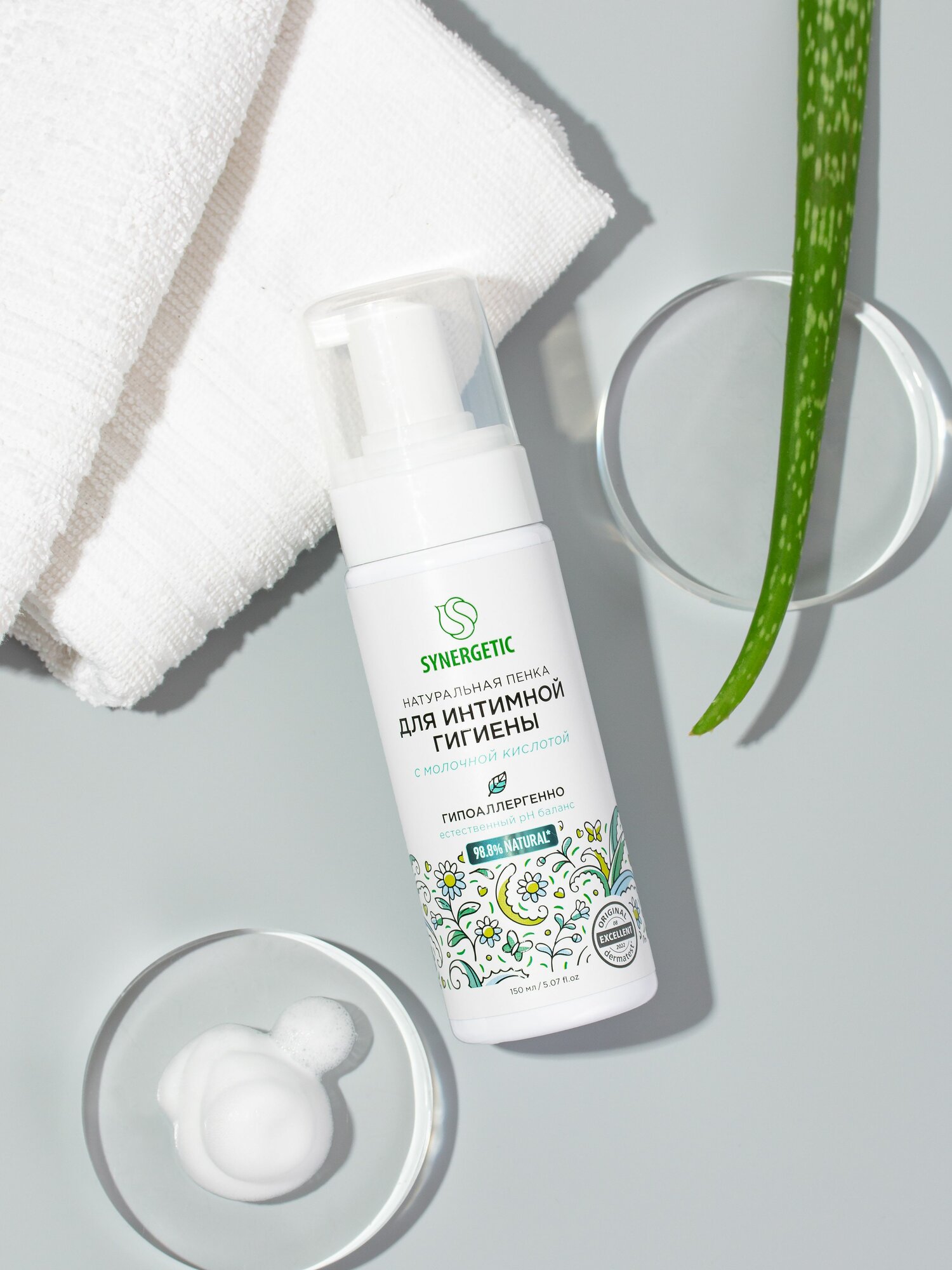 Натуральная пенка SYNERGETIC для интимной гигиены имеет легкую невесомую текстуру и обеспечивает деликатный ежедневный уход за самыми нежными местами. Средство легко смывается, обеспечивая комфорт и чувство свежести. Мультифункциональный компонент натурального происхождения софоролипид мягко очищает и сохраняет естественный микробиом, а натуральный пребиотик и природный антиоксидант трегалоза активно увлажняет и успокаивает чувствительную кожу. Бисаболол оказывает регенерирующее действие, способствует восстановлению гидробаланса. Активный увлажняющий комплекс в сочетании с соком алоэ вера обладает смягчающим, тонизирующим и противовоспалительным действием.