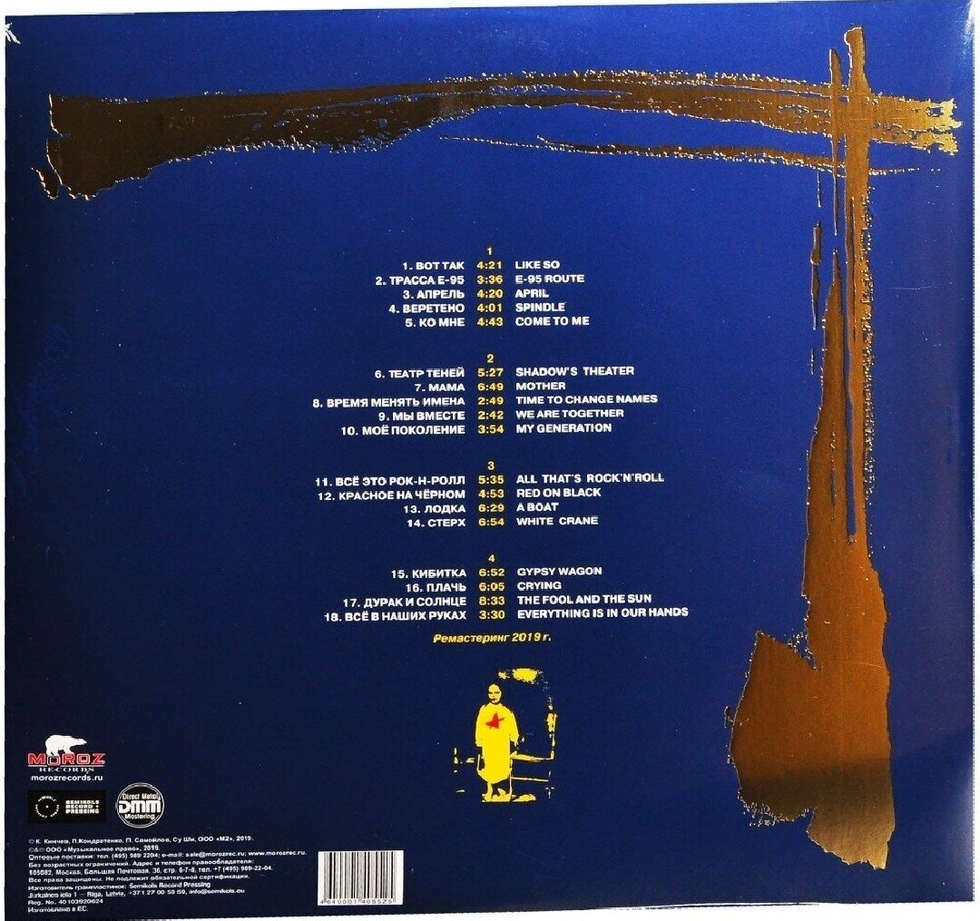 Коллекционное издание из серии "Легенды Русского Рока" представляет сборник раннее изданных песен питерской рок-группы Алиса. Первый выпуск альбома состоялся в 1996 году. Релиз представлен на двойном синем виниле в разворотном конверте с тиснением золотой фольгой. Трек-лист: LP1: A1. Вот так A2. Трасса Е-95 A3. Апрель A4. Веретено A5. Ко мне B1. Театр теней B2. Мама B3. Время менять имена B4. Мы вместе B5. Моё поколение LP2: C1. Всё это рок-н-ролл C2. Красное на чёрном C3. Лодка C4. Стерх D1. Кибитка D2. Плач D3. Дурак и Солнце D4. Всё в наших руках Алиса - советская и российская рок-группа, образованная в 1983 году в Ленинграде. Лидер и автор большинства песен Алисы - вокалист Константин Кинчев. В настоящее время группа активно работает над записью новых произведений, является одной из популярнейших групп в России и выступает в качестве хедлайнера на различных фестивалях. Легенды русского рока - серия ретроспективных коллекционных альбомов-сборников групп русского рока, выпускаемая с 1996 года лейблом Moroz Records. Серия была задумана продюсерами Константином Преображенским и Василием Гавриловым. Для каждой группы или исполнителя был подготовлен отдельный альбом в серийном оформлении, разработанном Василием Гавриловым.