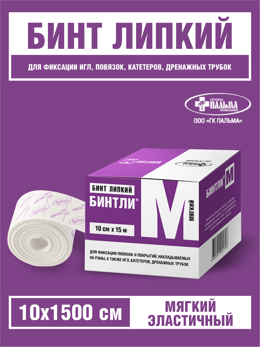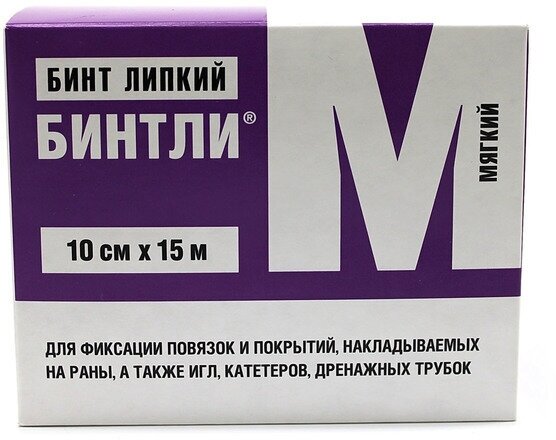 Липкий бинт БИНТЛИ® предназначен для фиксации повязок и покрытий, накладываемых на раны, а также для фиксации игл, катетеров, дренажных трубок, кало- и уроприёмников и других медицинских устройств.Липкий бинт БИНТЛИ® изготовлен из нетканого материала, покрытого гипоаллергенным акрилатным клеем. Благодаря своей воздухо- и паропроницаемости липкий бинт БИНТЛИ® создаёт комфортные условия для раны и кожи вокруг неё, позволяя коже «дышать», а используемый клей снижает до минимума вероятность раздражения кожи.Клеевой слой закрыт антиадгезионной бумагой, которую необходимо снять перед наклеиванием бинта.Выпускается две модификации, различающиеся по степени драпируемости:БИНТЛИ®–Т производится из нетканого материала, состоящего из 100 %-го полиэфирного волокна. Этот бинт не растягивается при использовании и предназначен для фиксации повязок, игл, катетеров, дренажных трубок и т. д.БИНТЛИ®–М производится из нетканого материала, состоящего из смеси полиэфирного волокна и вискозы. Этот бинт обладает гораздо большей драпируемостью, что делает его очень удобным для фиксации повязок на поверхностях со сложным рельефом, локтевых, коленных суставах и т. п.Бинт липкий БИНТЛИ®длительно и надежно удерживает повязки на рансоздаёт комфортные условия для раны и кожи вокруг неё;непроницаем для микробов и защищает рану от инфекции.БИНТЛИ® выпускается в рулонах шириной 5 см, 10 см и 15 см различной длины, а также в виде отрезков 10 х 25 см. Срок годности изделия 5 лет. Противопоказания: индивидуальная несовместимость с компонентами сырья изделия.