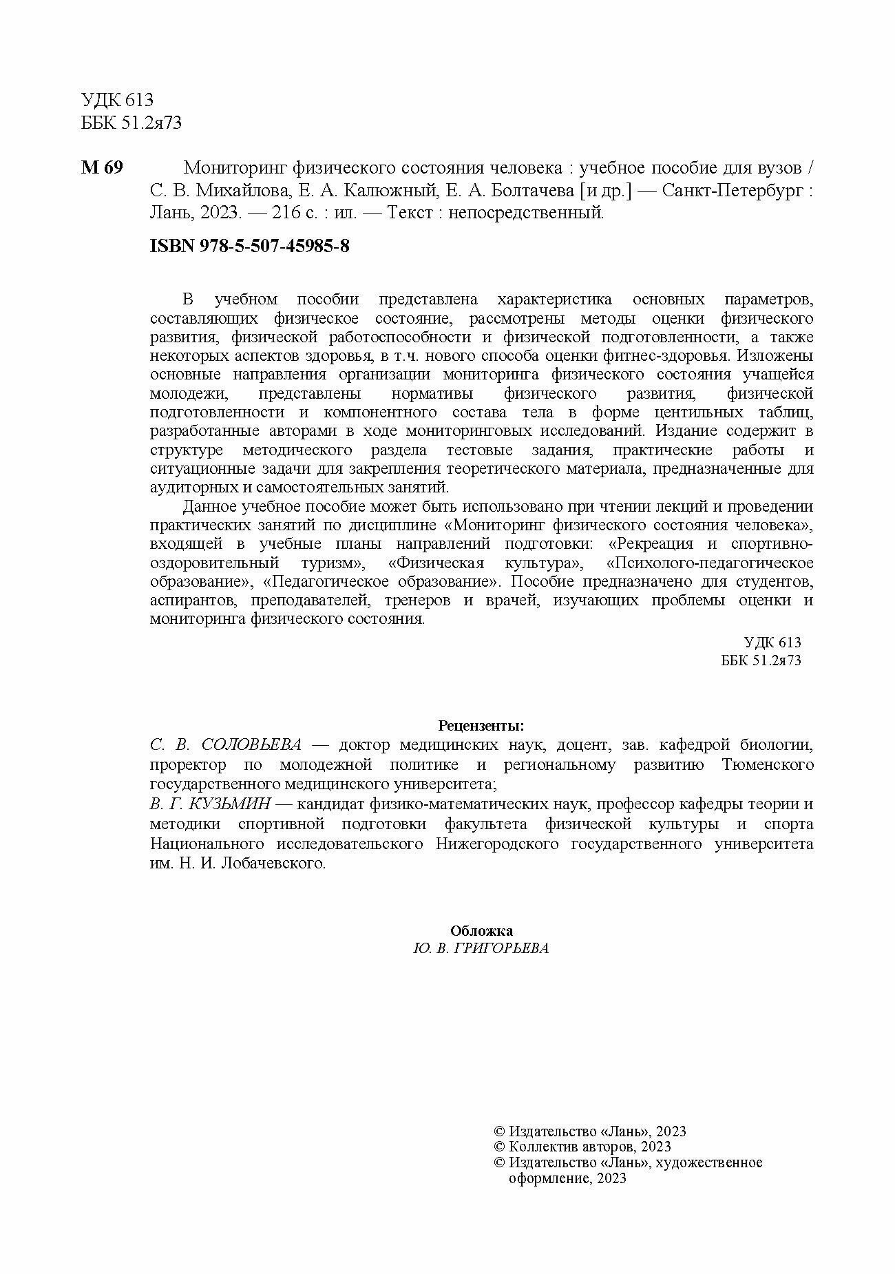 Мониторинг физического состояния человека. Учебное пособие для вузов (Михайлова Светлана Владимировна, Калюжный Евгений Александрович, Болтачева Елена Александровна); Лань, 2023