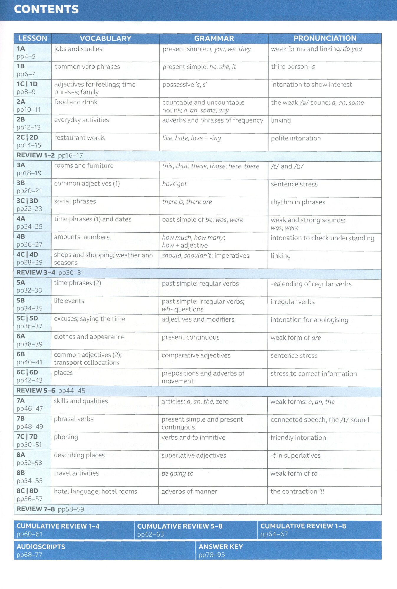 The Workbook provides additional practice of material covered in the eight units of the Students' Book, including: